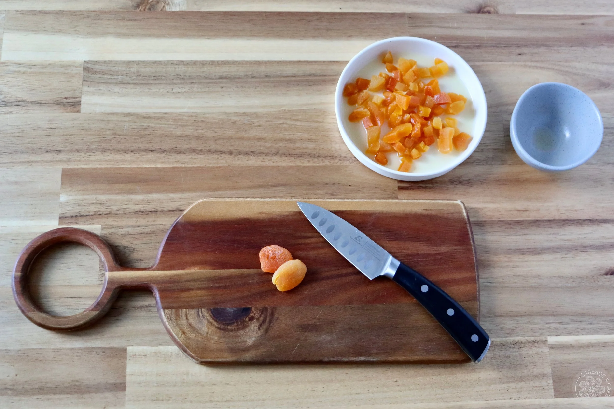 Cut dried apricots into small cubes, place in a small bowl and soak in amaretto or apple cider.