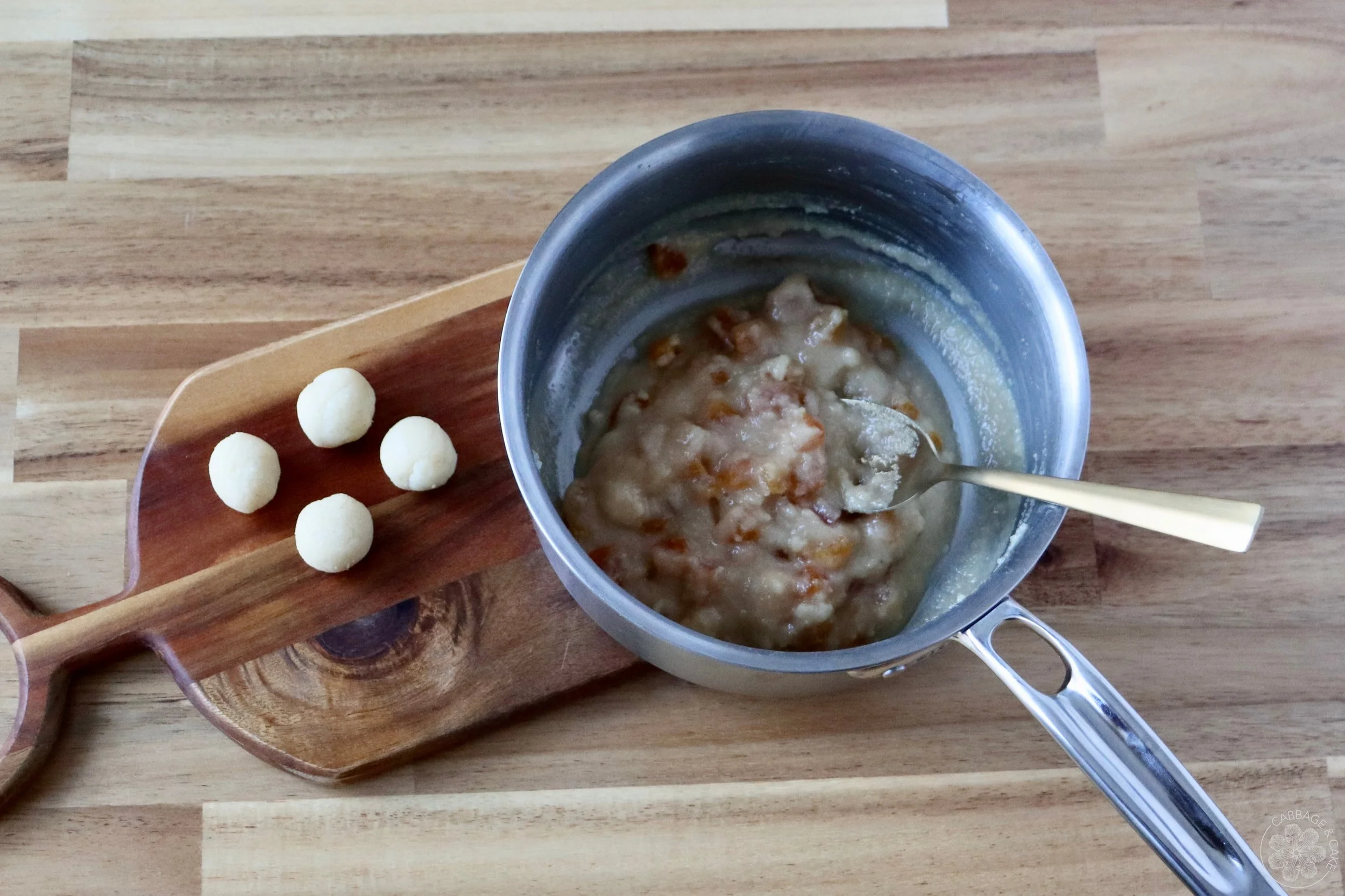 Plug the bottom of the apples with the marzipan balls to avoid the filling from running out.