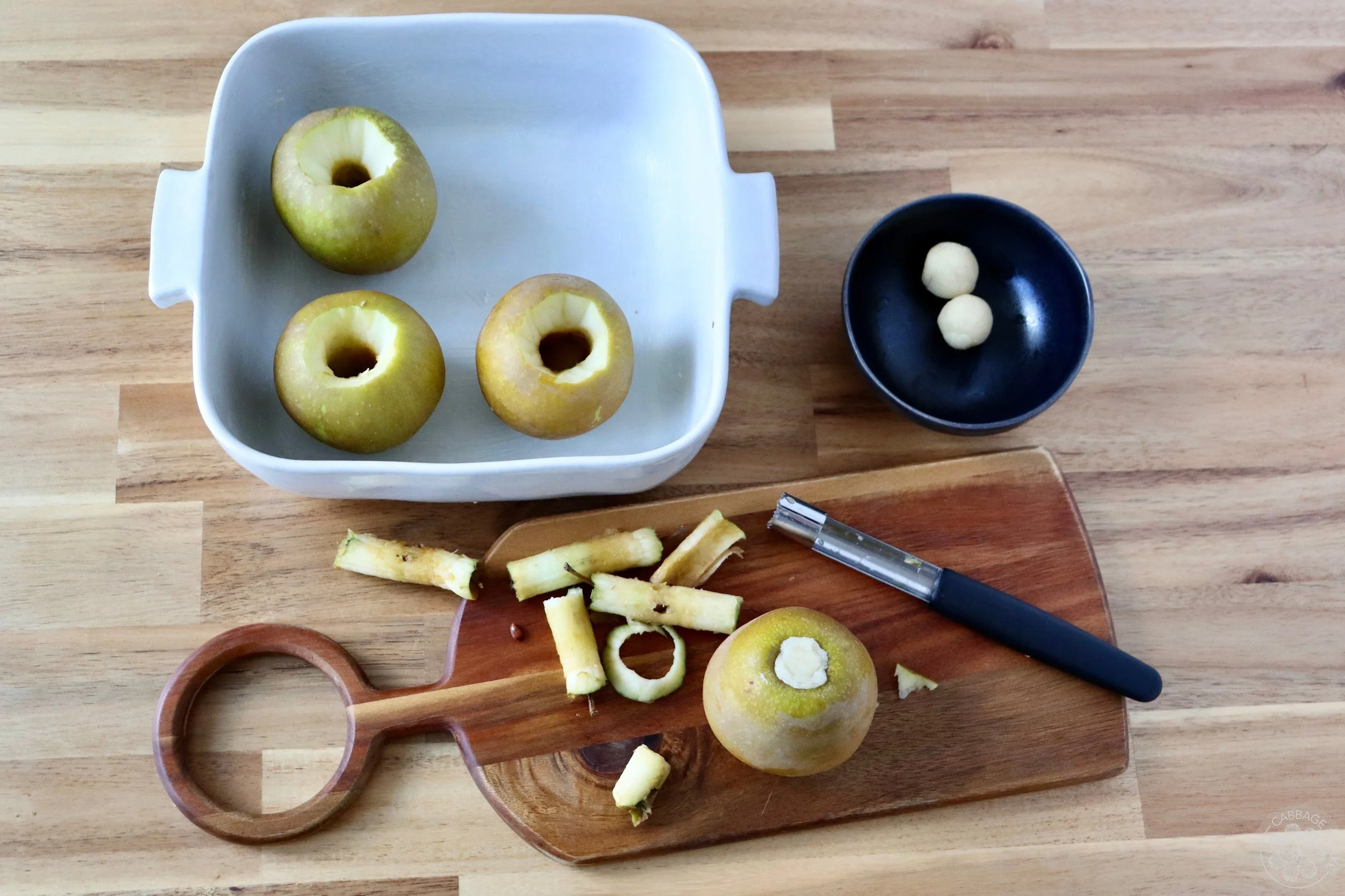 Wash, core and cut the opening of the apples a bit wider to fit more filling. Plug the bottom with the marzipan balls to avoid it from running out.
