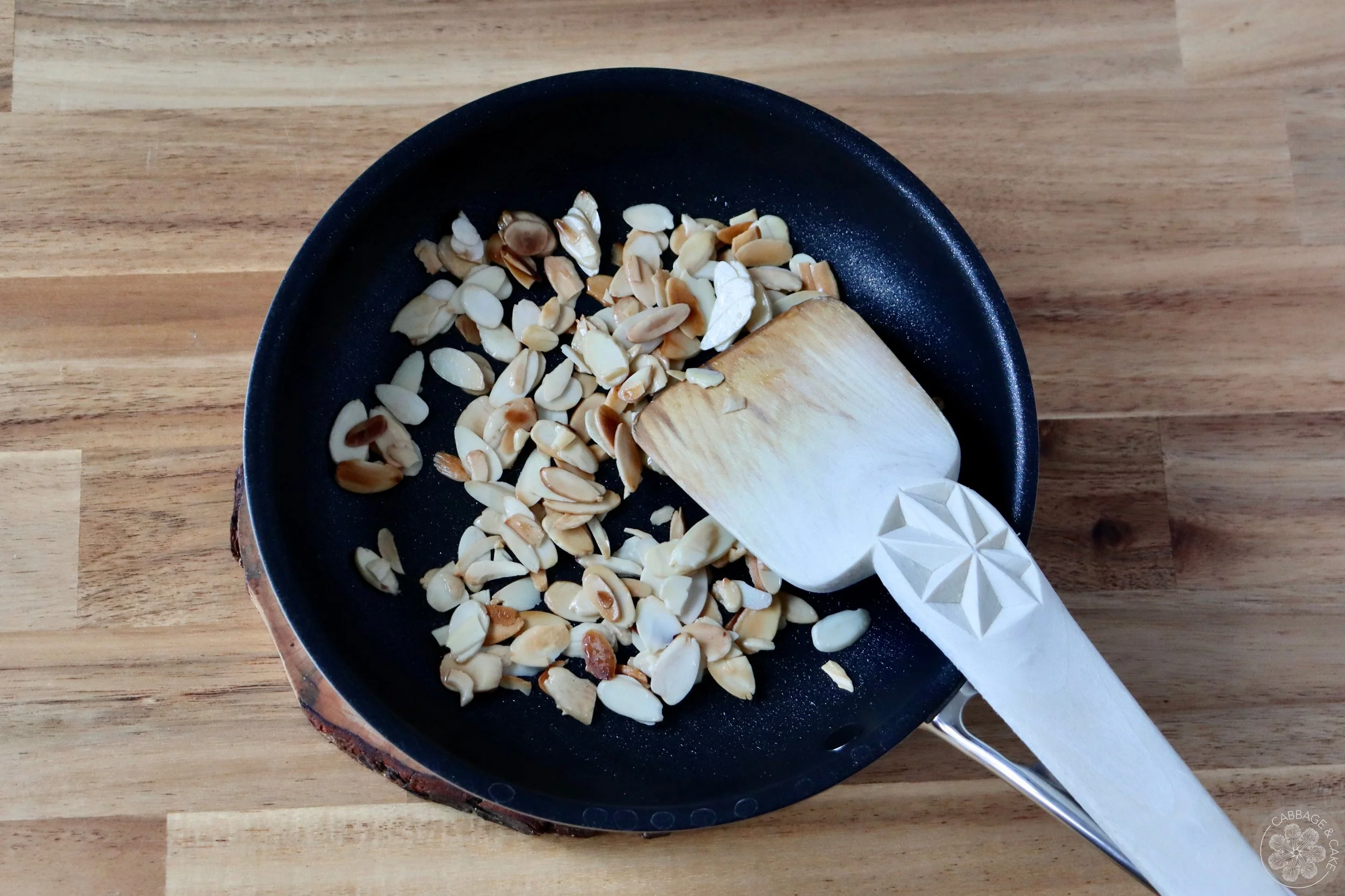 Roast slivered almonds in a small pan on medium heat with a tsp of butter until they turn slightly golden. Keep a close eye on them and keep tossing the pan.