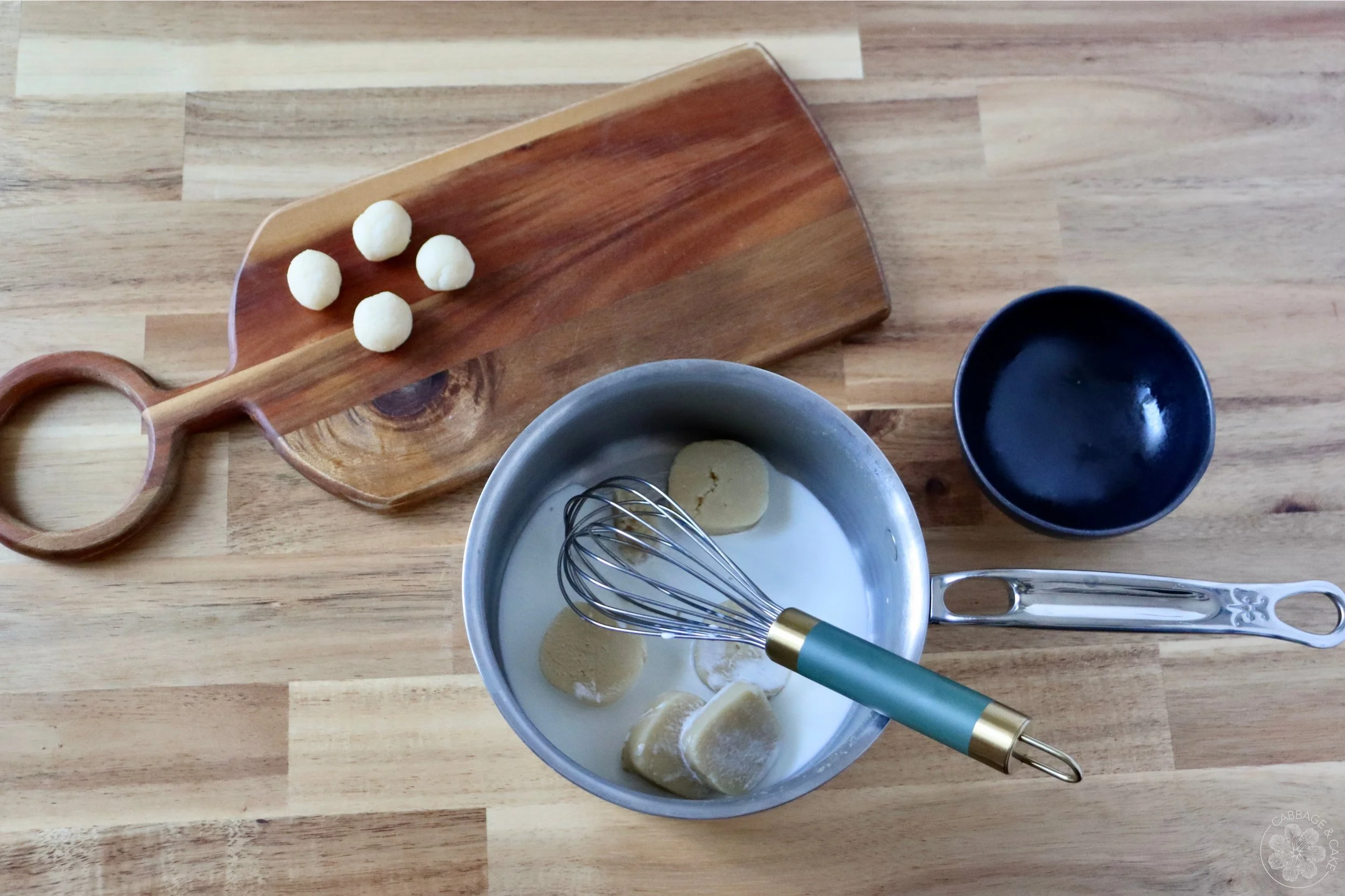 In a small saucepan combine marzipan and 3 tbsp of whipping cream. Stir on low-medium heat until soft and well combined.