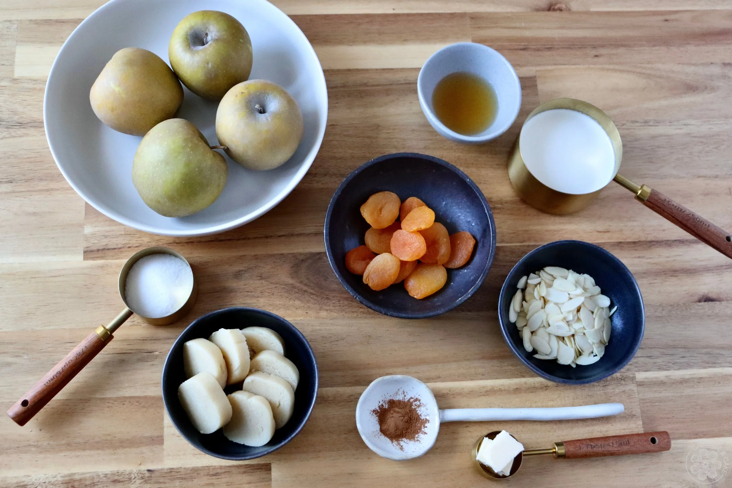 Traditionally “Bratäpfel” are cored baked apples filled with a mixture of nuts, butter, sugar and raisins soaked in rum. Honestly, I’m not a big fan of raisins, so using dried apricots and marzipan is a great alternative to the usual ingredients.