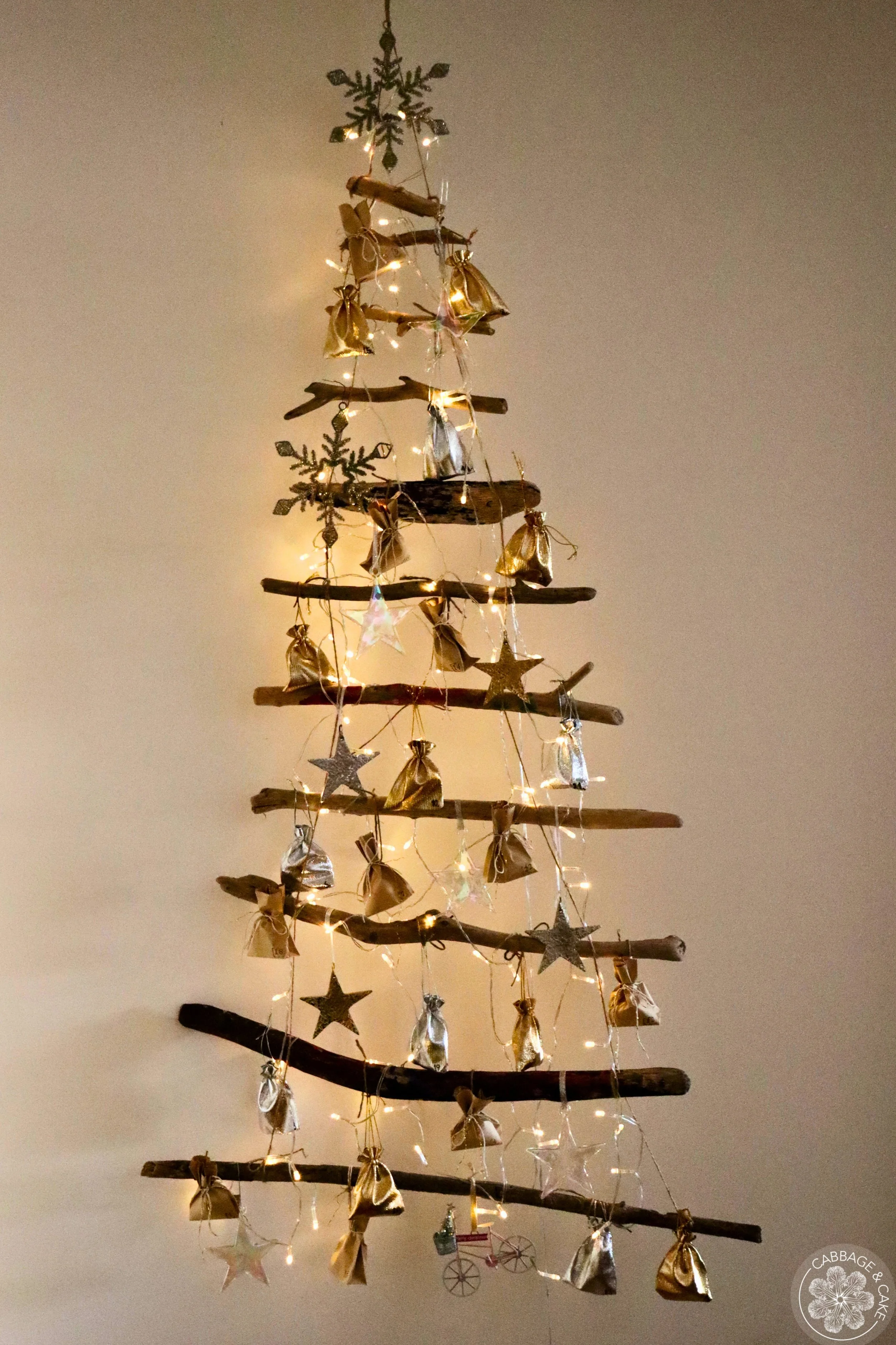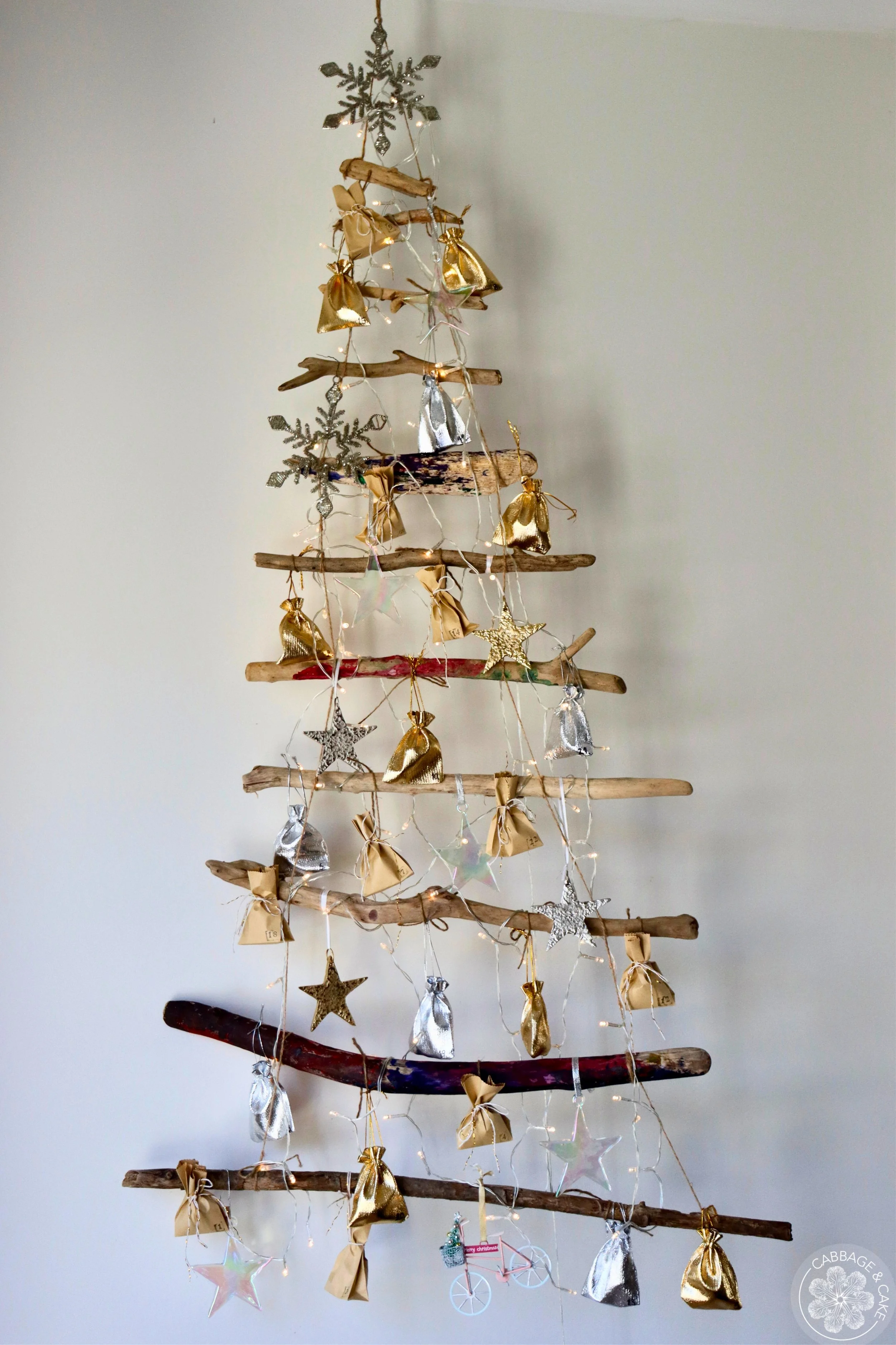The advent calendar is made from 11 pieces of driftwood of different lengths in the shape of a Christmas tree, connected by twine and decorated with small, numbered pouches and paper bags, lights and some Christmas ornaments which I usually change every year.