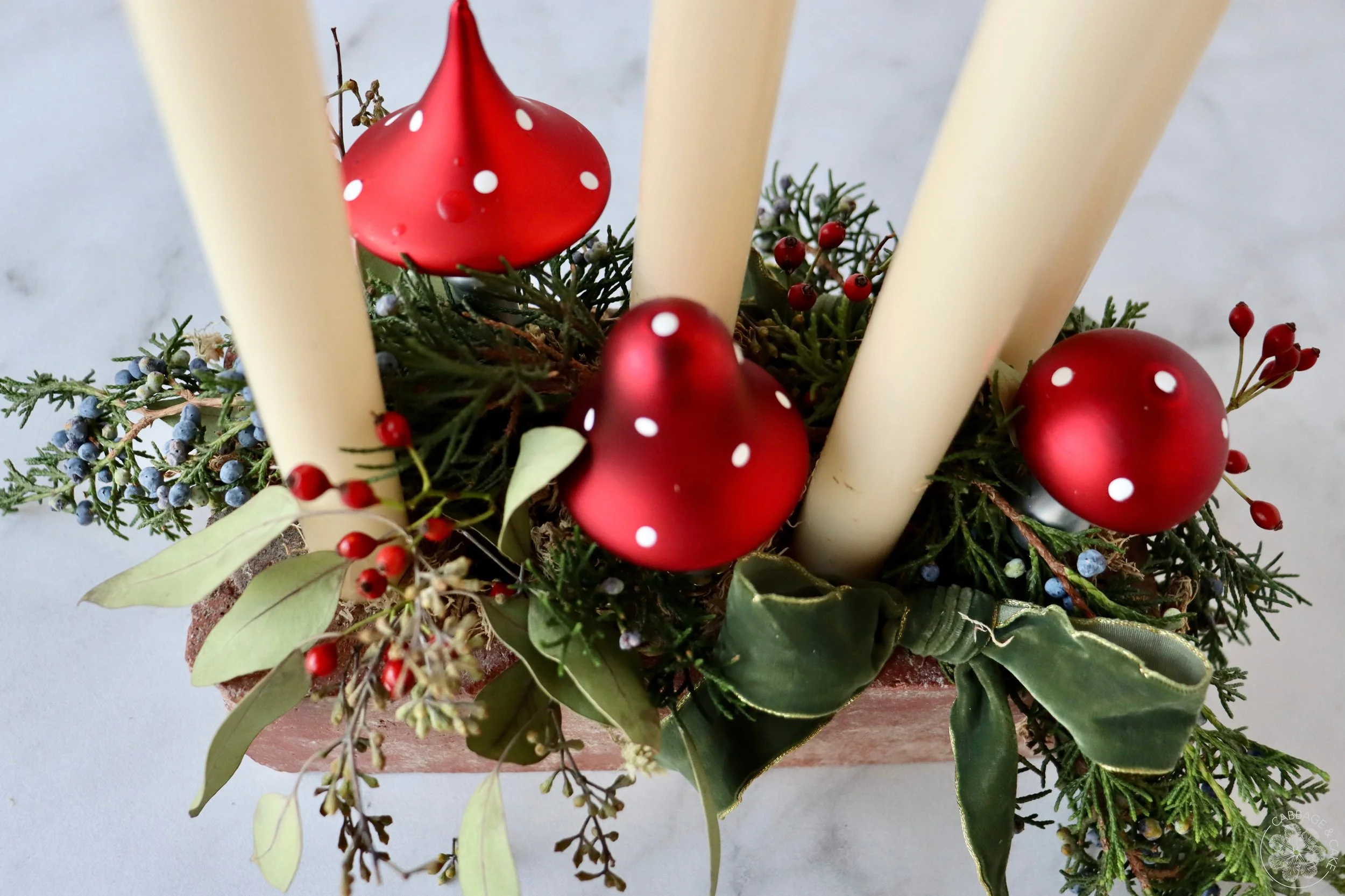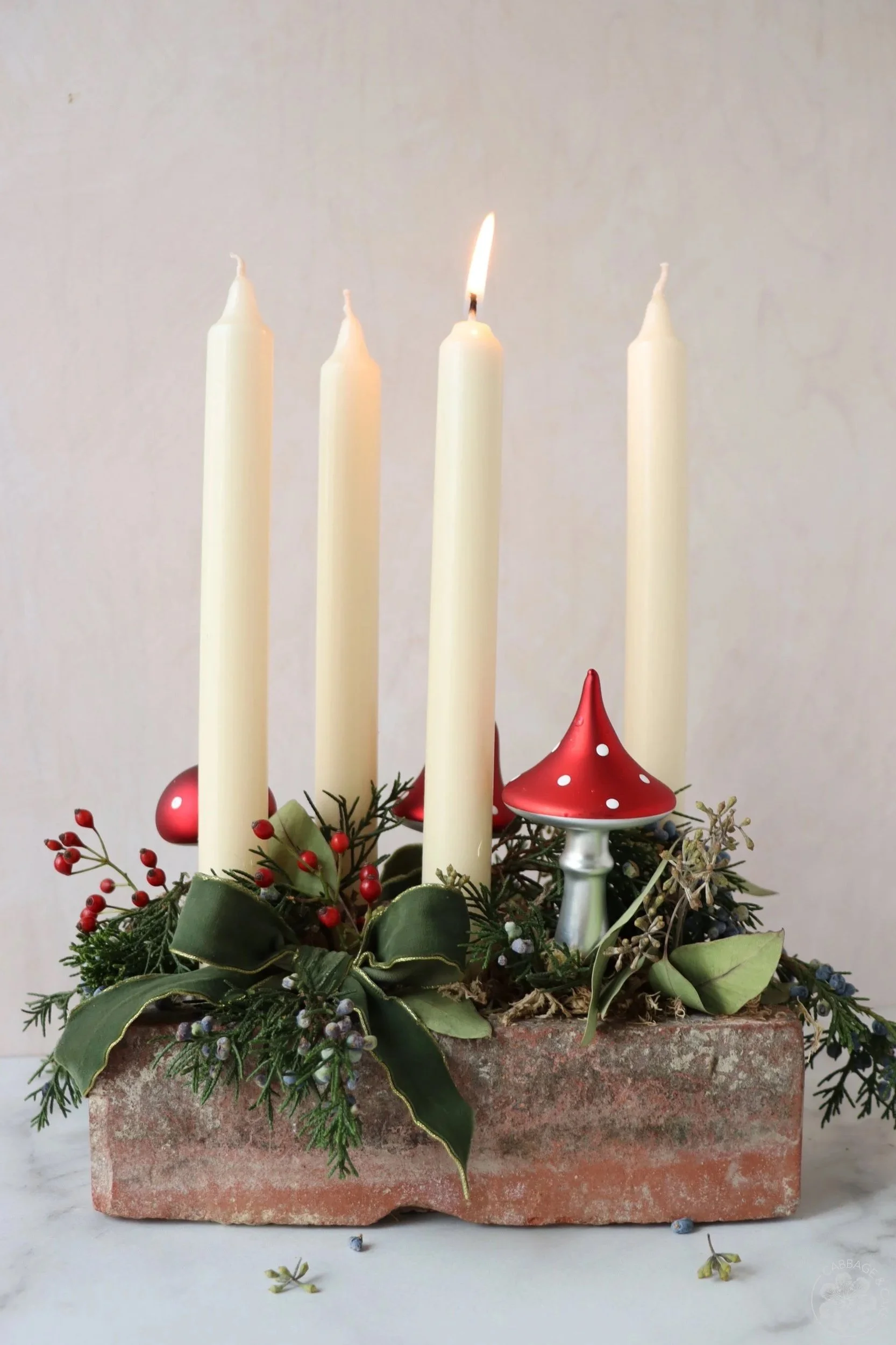 This year however, I found an old brick on one of my walks on the beach and I decided to repurpose it to hold our advent candles instead of putting them on a wreath. I brought it home, chiseled out the old mortar and gave it a good rinse. After some decorating with moss, juniper greens, eucalyptus, mini rose hips, some mushroom Christmas ornaments and pretty green and gold bows, we are excited to light our first candle on the first advent Sunday next week.