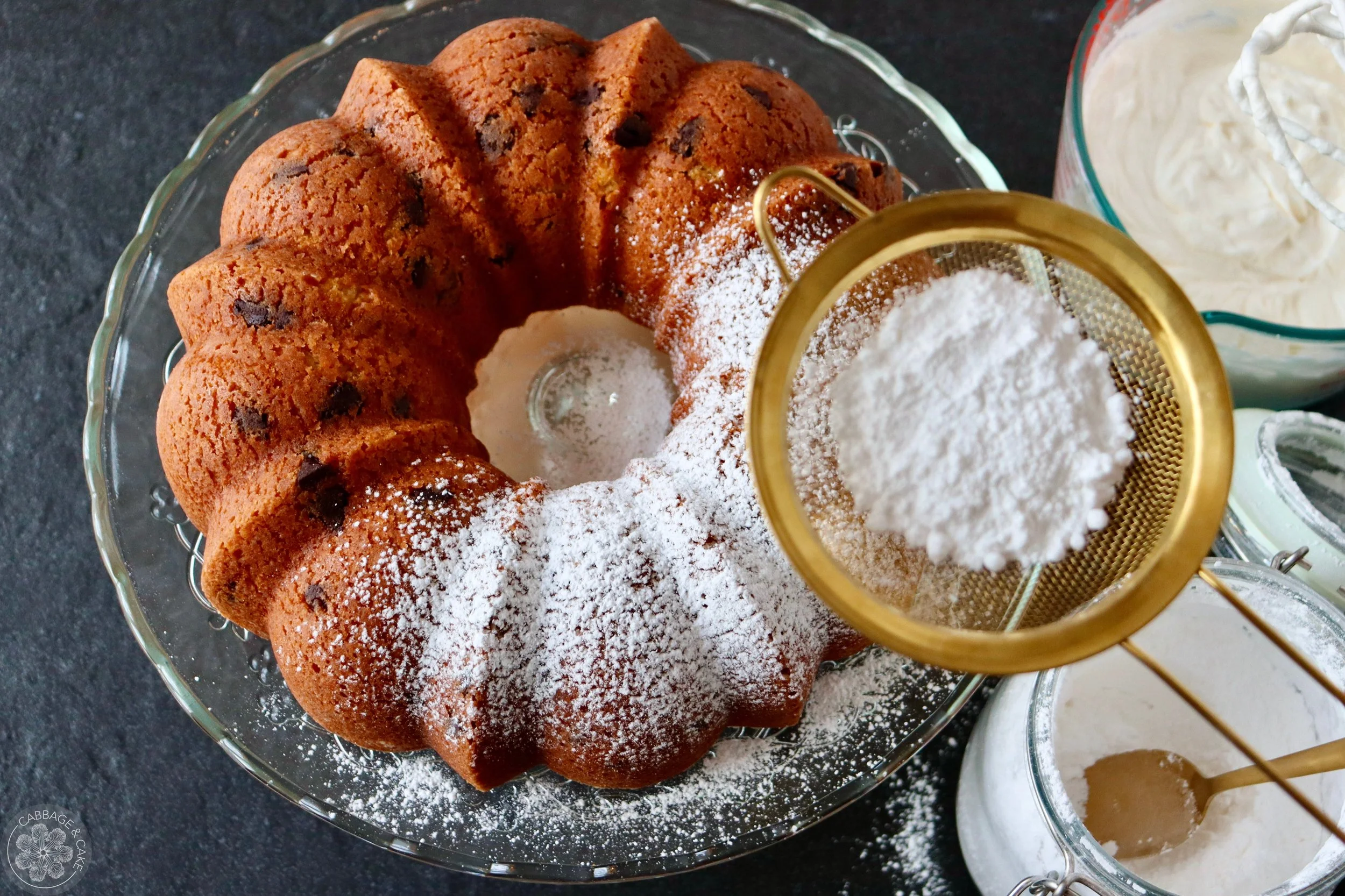 Dust your festive chocolate chip bundt cake with some icing sugar and serve with a dollop of whipped cream.