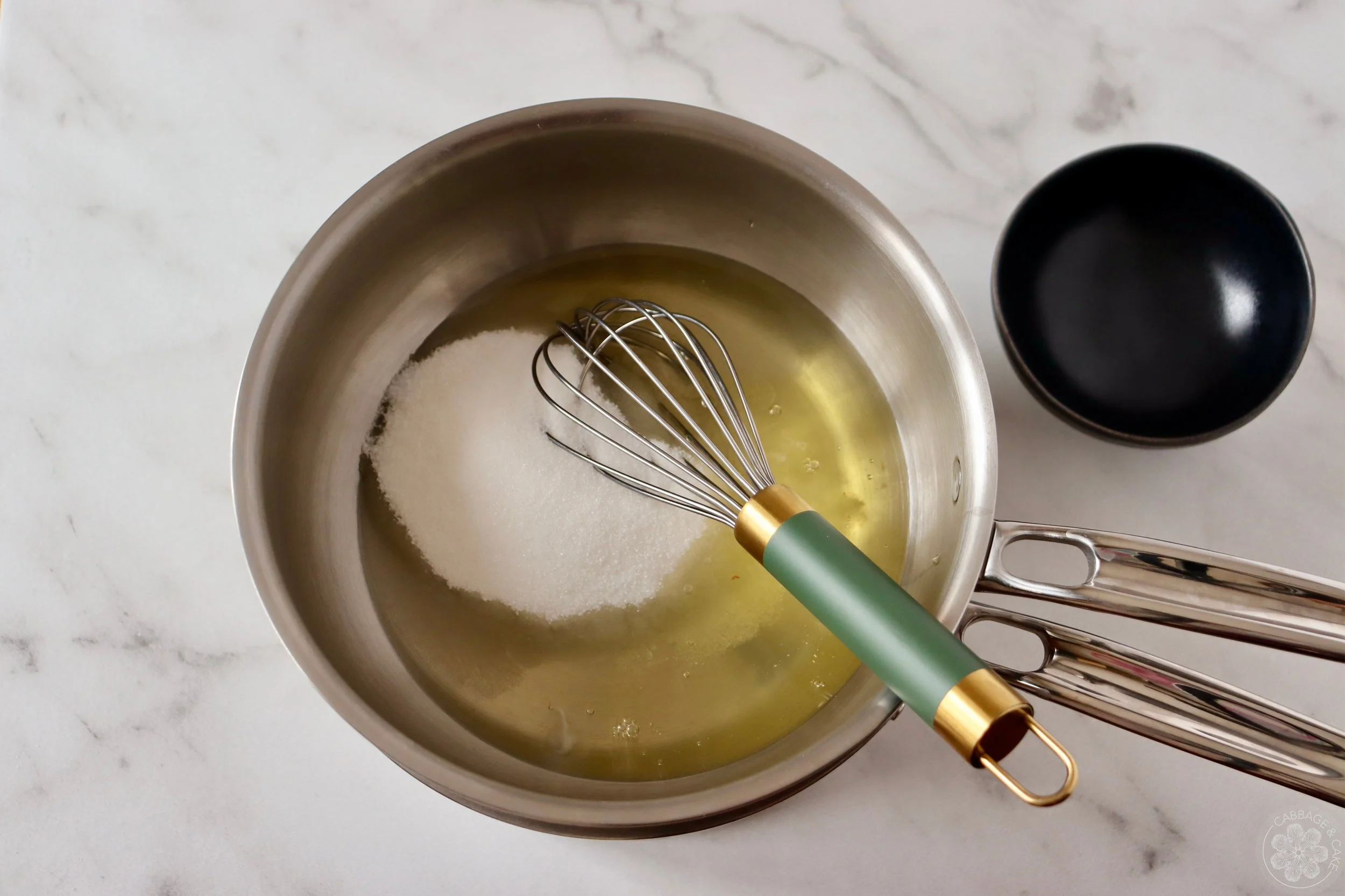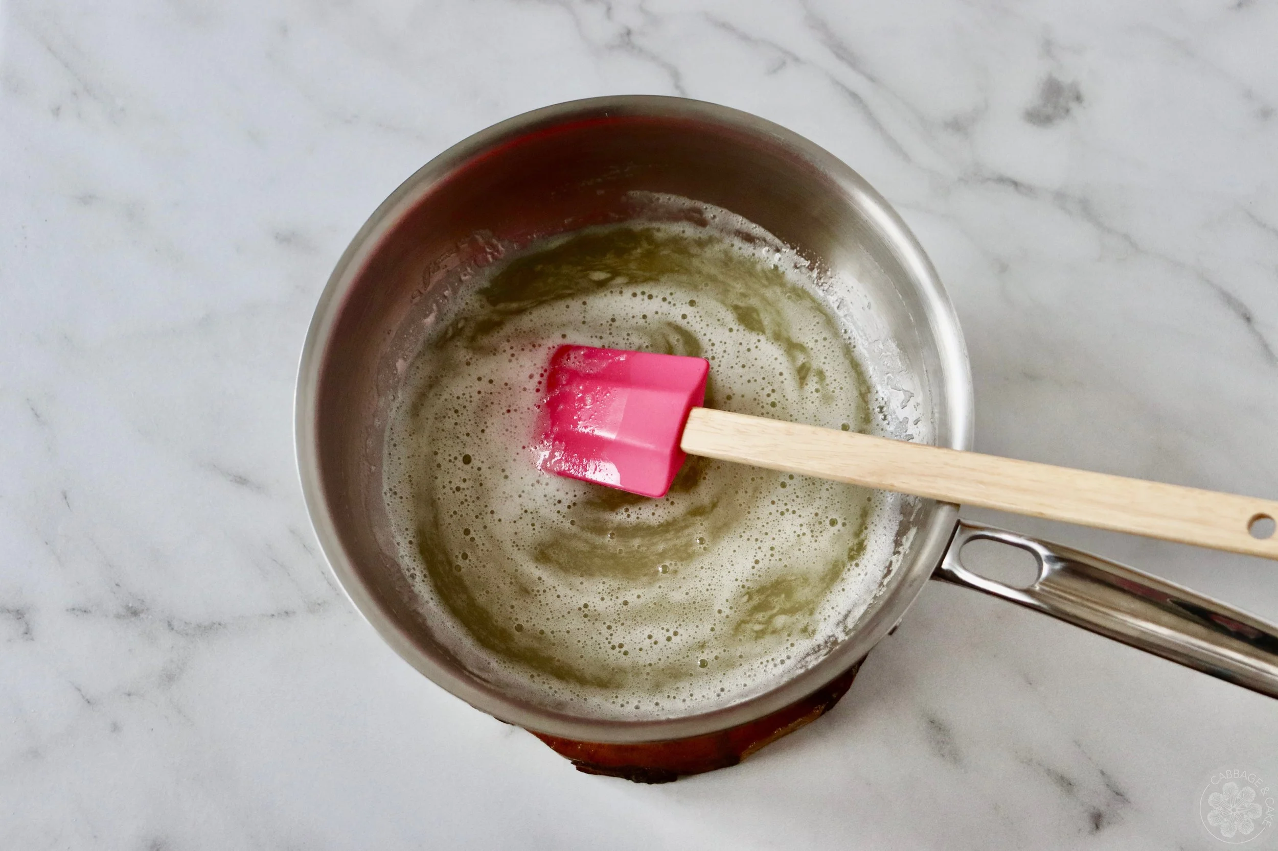 Into a heatproof bowl or saucepan whisk together the egg whites and sugar and set over the simmering water. Stir continuously, but gently until the sugar has dissolved completely. Turn the heat to a low and be careful not to make scrambled eggs, you just want the sugar crystals to dissolve.