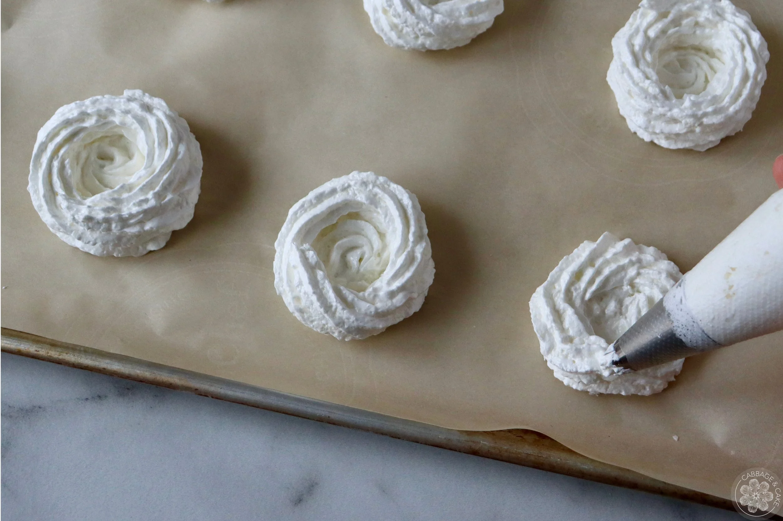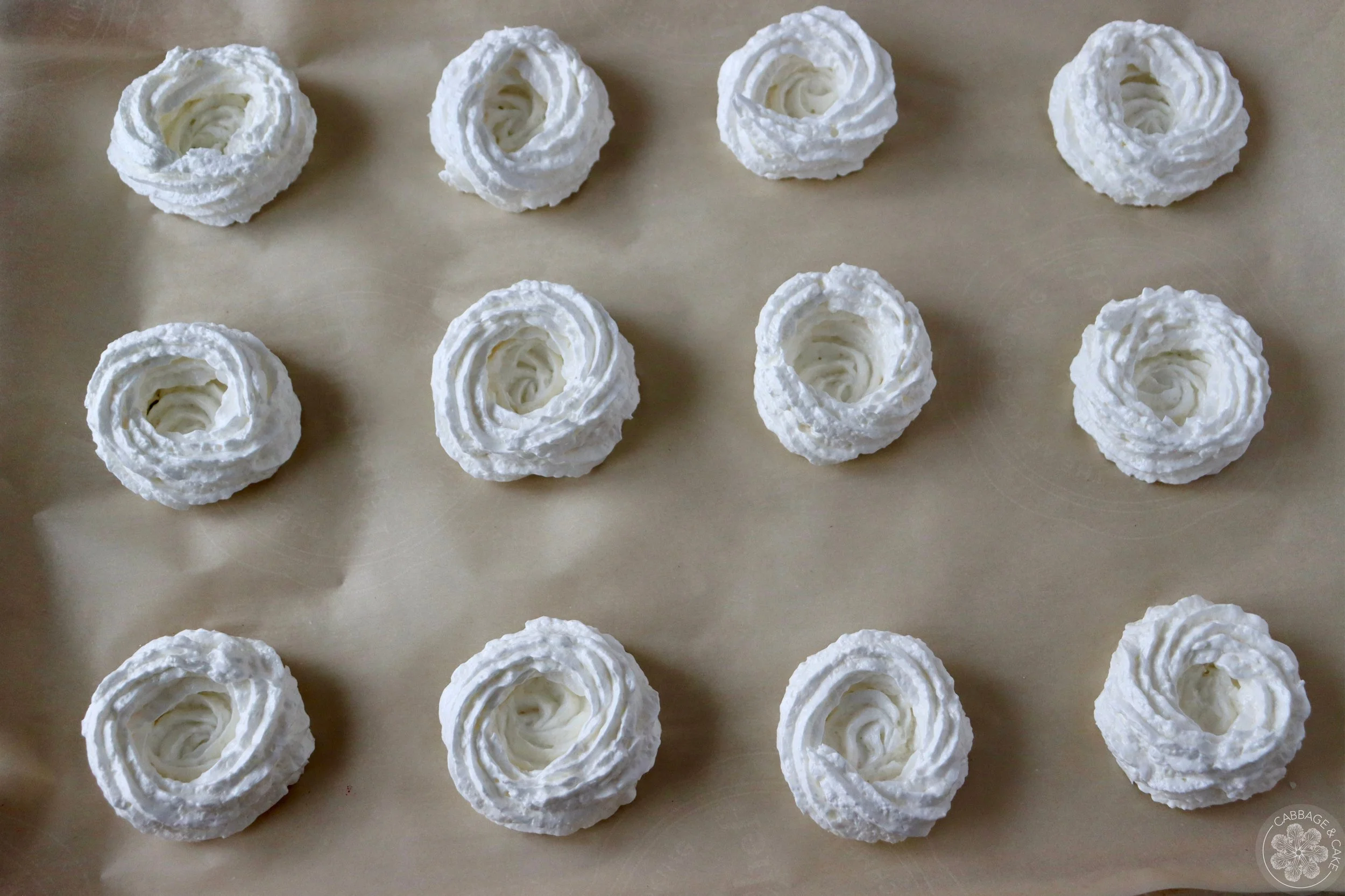 Pipe 10-12 Easter nests by piping a solid disk with 2-3 circular layers around on the prepared baking sheet. Make sure to leave 1/2-1 inch space between the meringue nests.