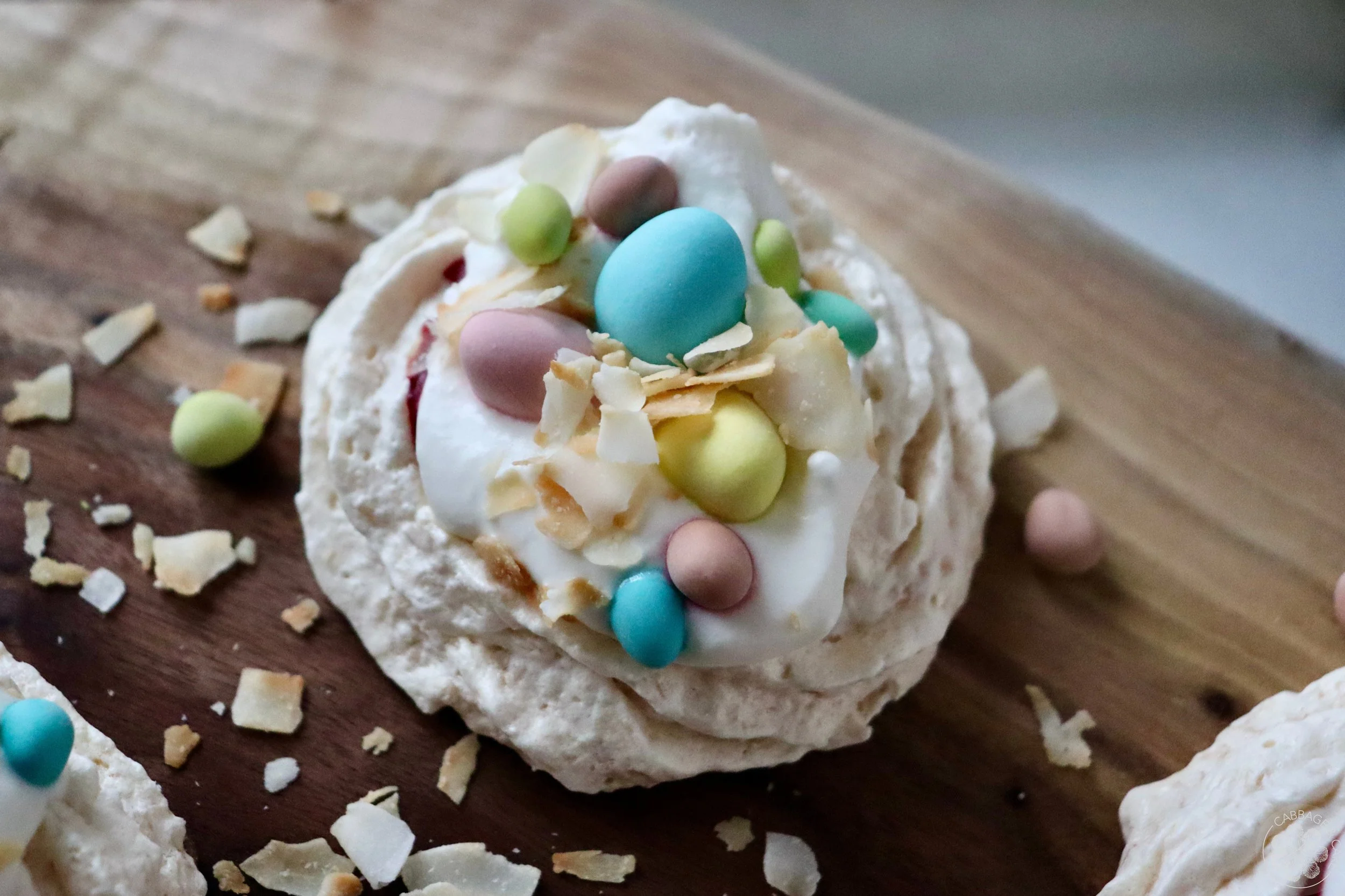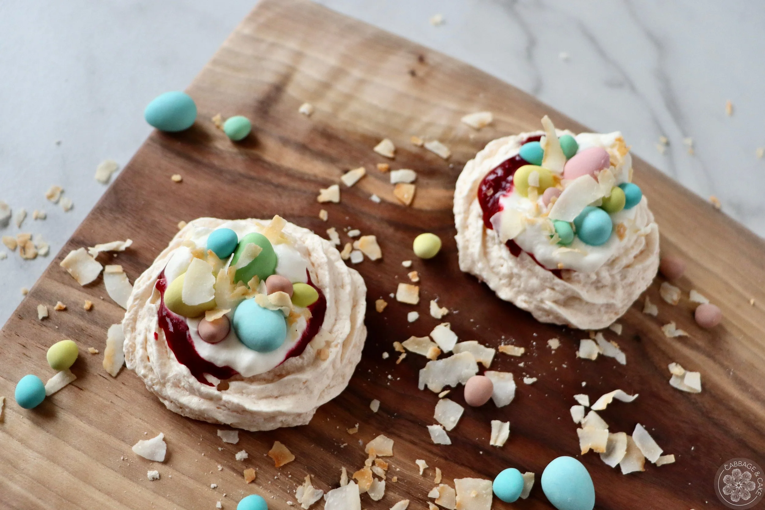These cute little Easter nests are made with a delicious crunchy and chewy coconut meringue, filled with tart raspberry purée and whipped cream, and decorated with mini Easter egg candies and toasted shredded coconut. You could fill the nests with different fillings, but I absolutely love and recommend you try out the combination of coconut meringue, raspberries and whipped cream!