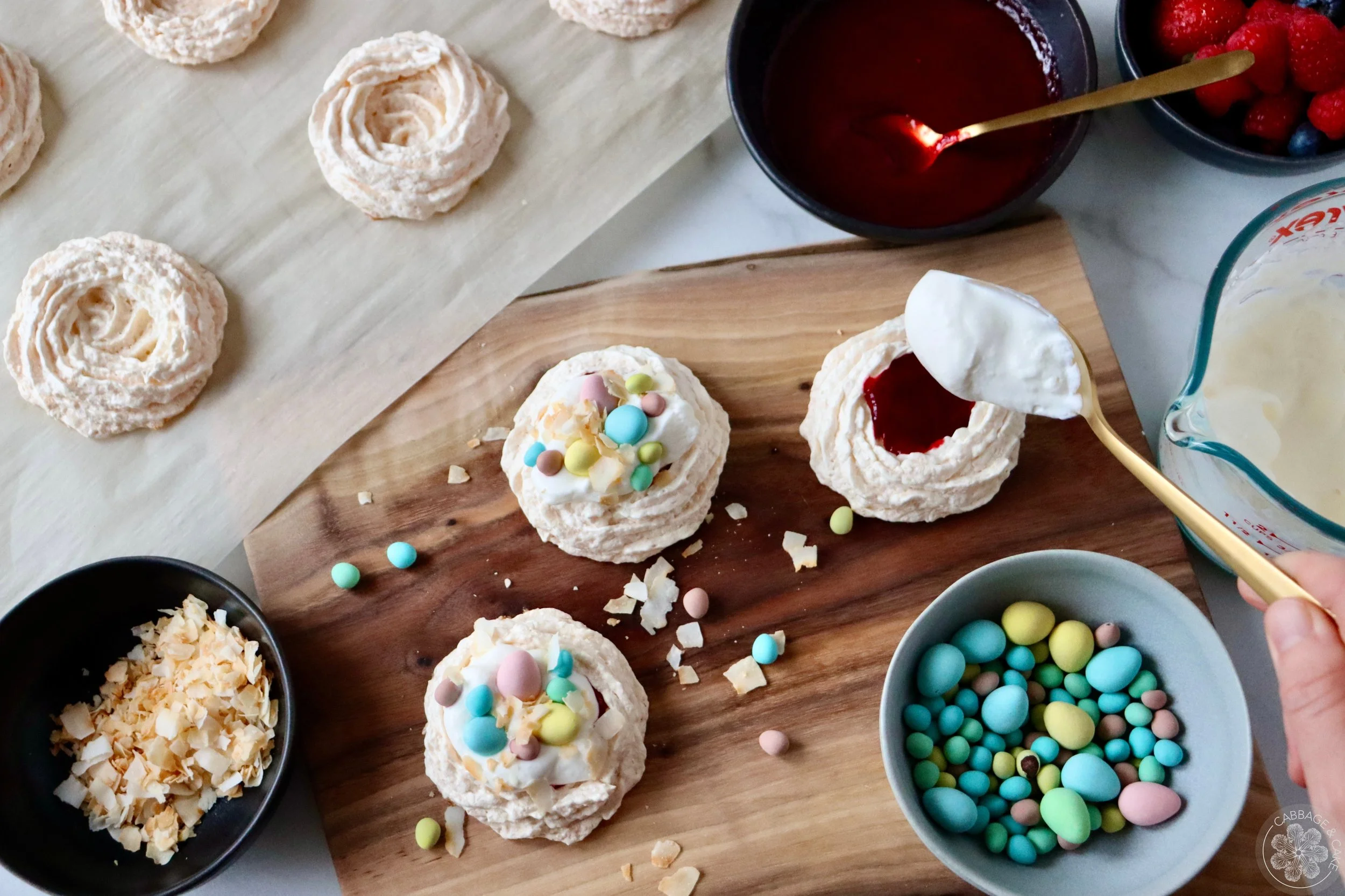 Before you assemble your meringue nests, make sure all your components are cooled down completely, to avoid them from getting soggy.
