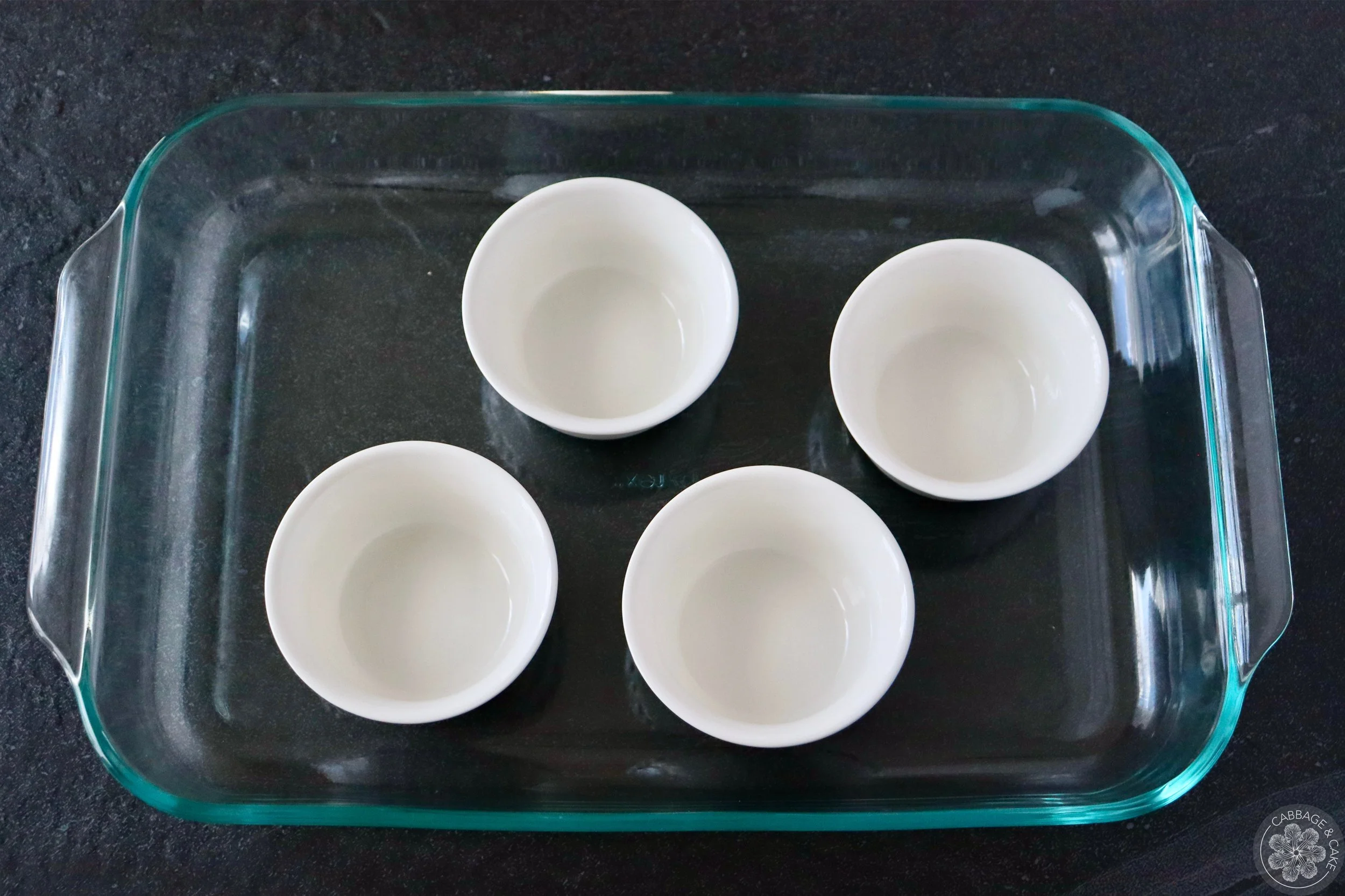 Preheat the oven to 325°F (160°C) and set your ramekins into the ovenproof dish.
