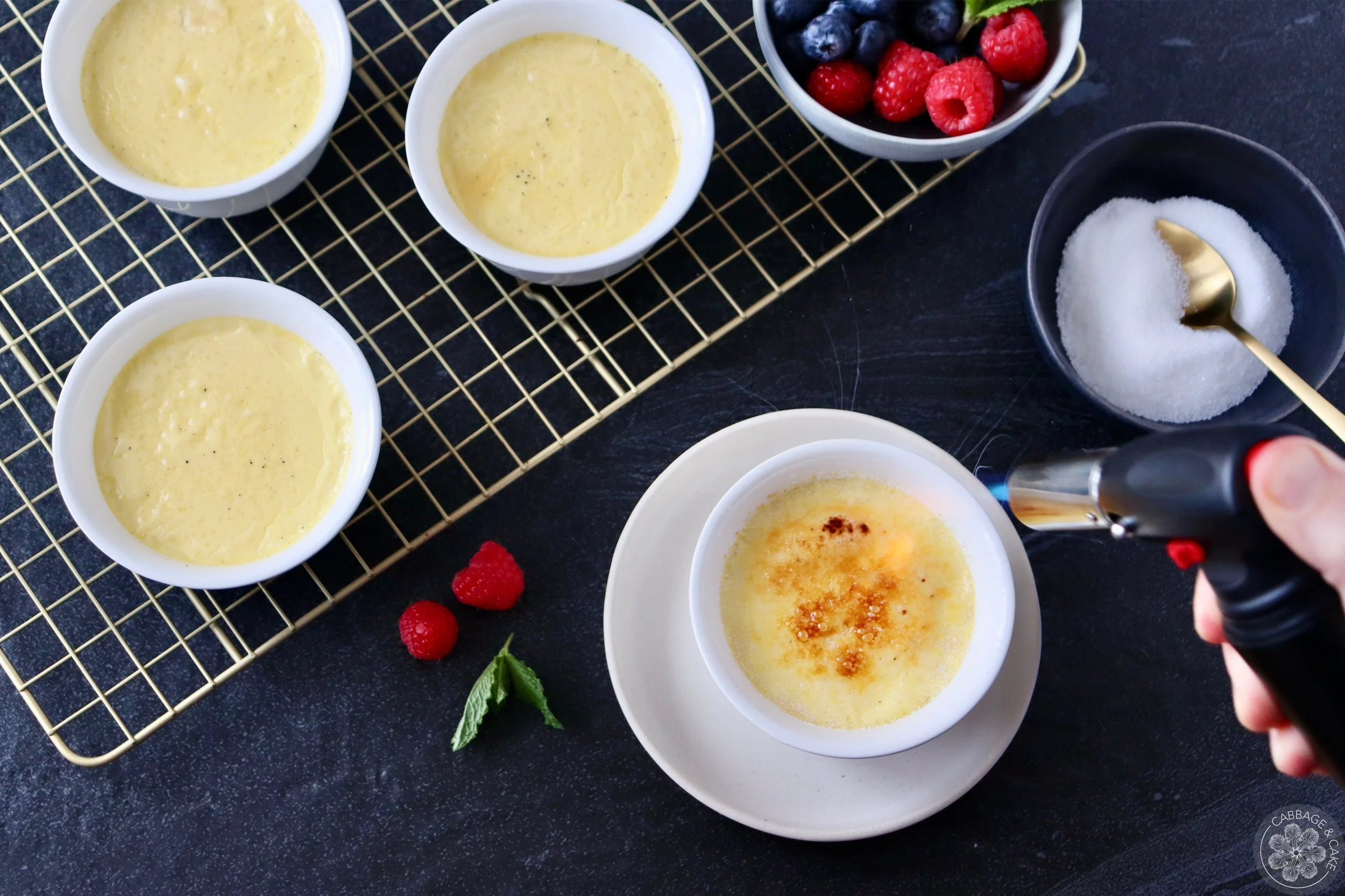 Making this super smooth and extra creamy dessert is actually not that hard and is excellent to make ahead for a party or holiday dinner. You can easily make crème brûlée the day before, torch it right before serving, and decorate it with some fresh fruit.