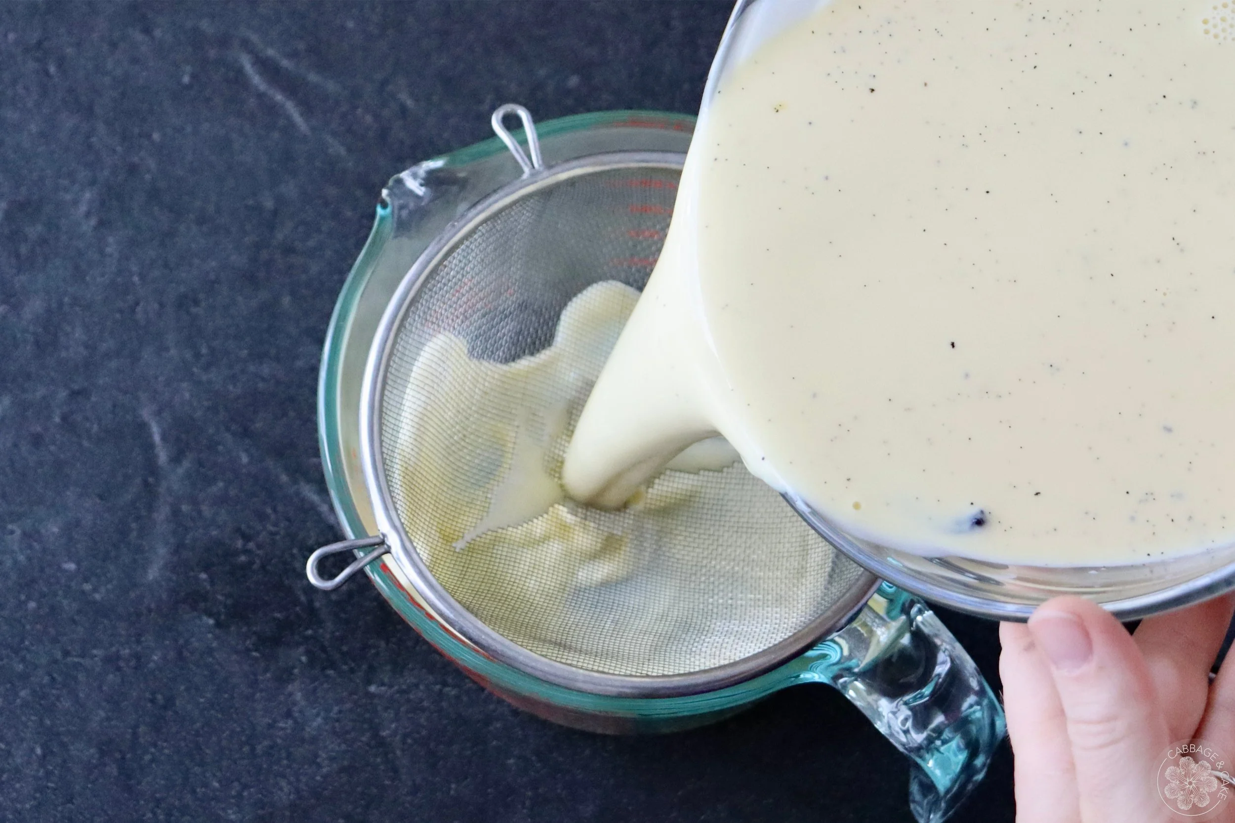 Set a fine mesh strainer on the small pot or a pitcher/ pyrex and strain out the vanilla pod from your custard base.