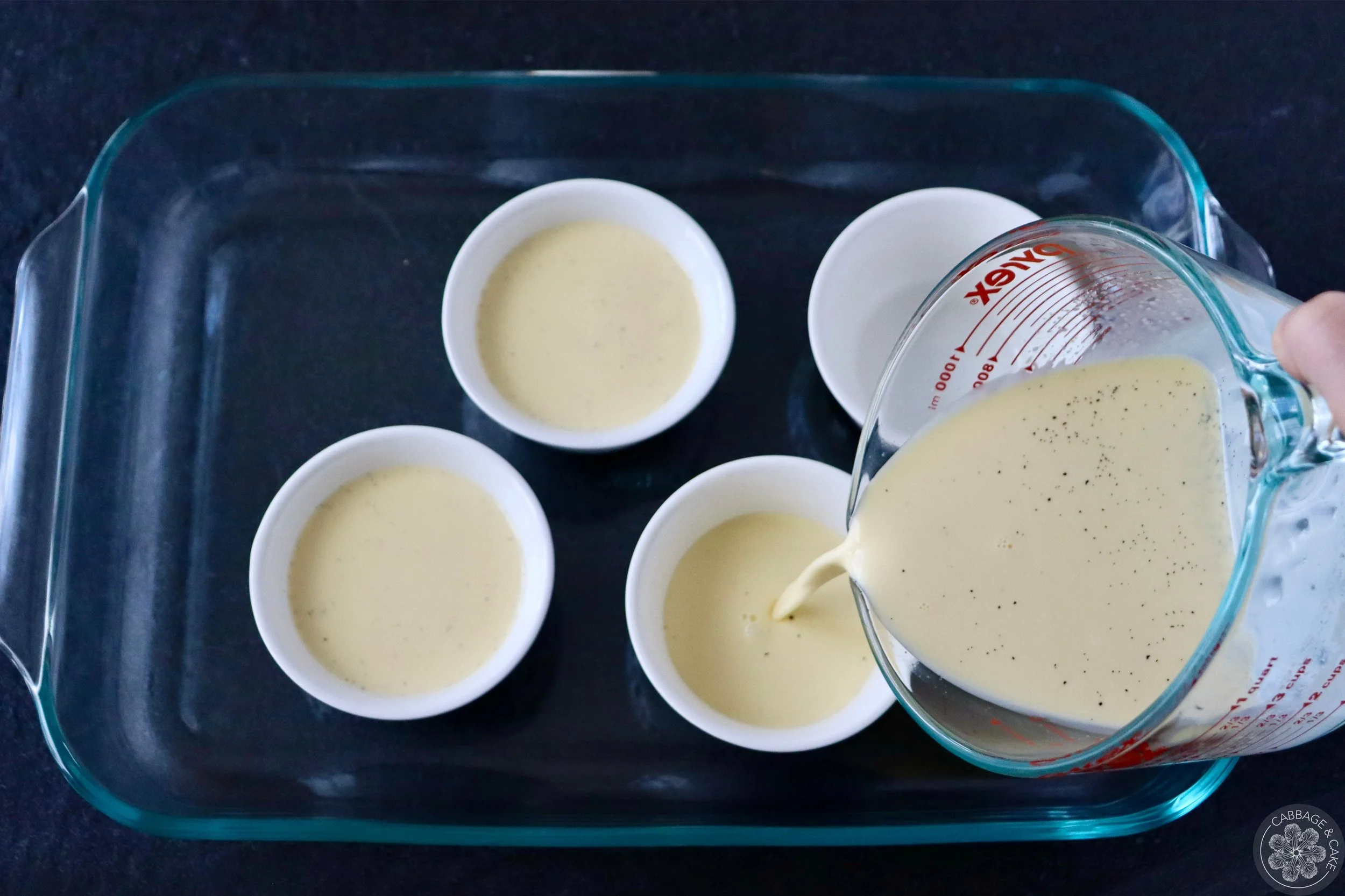 Pour the custard into the ramekins, dividing it equally between them, and filling them almost to the top.