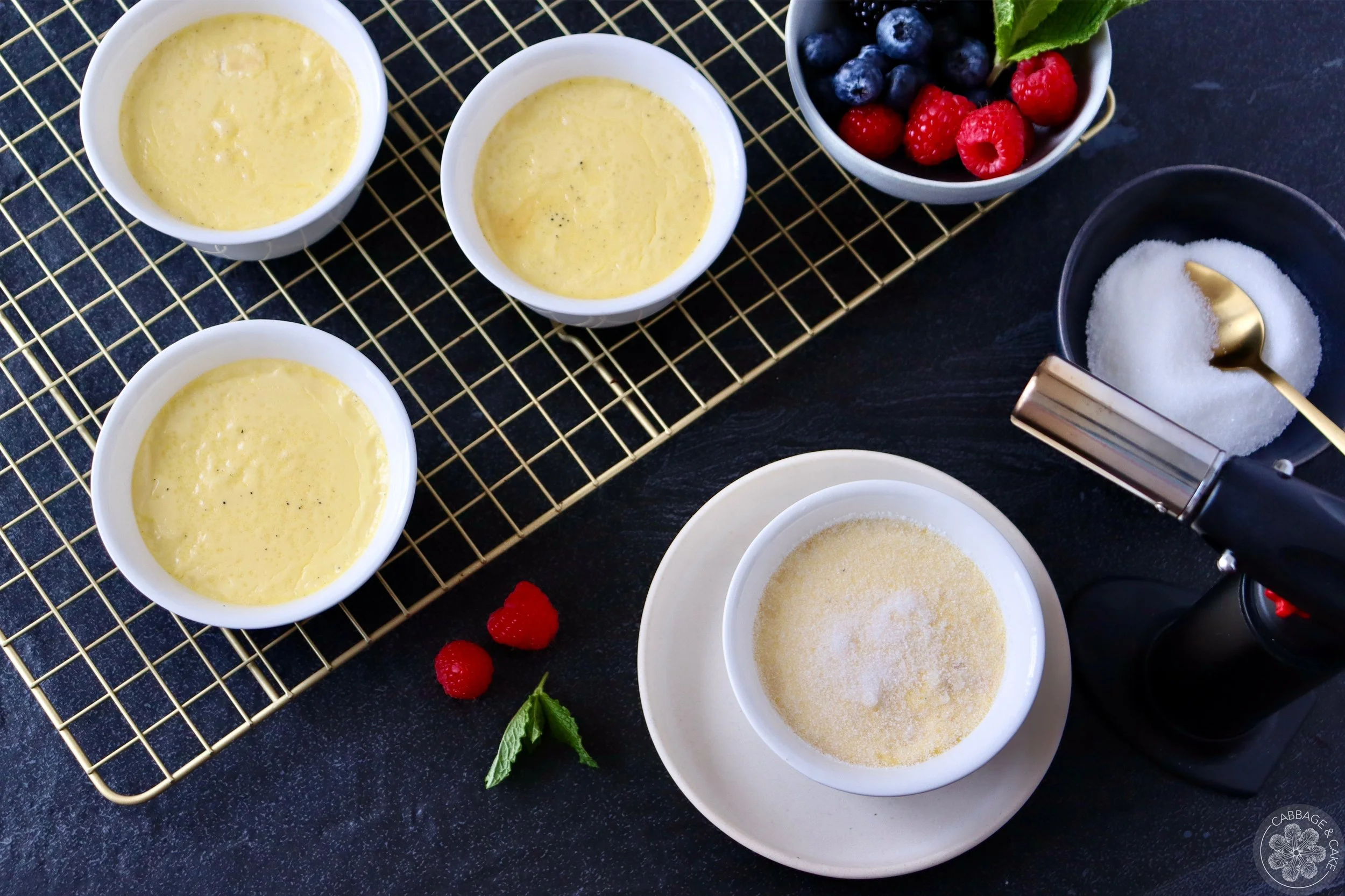 All you really need is some heavy cream, a little bit of milk, sugar, egg yolks and Vanilla beans along with some ramekins, a butane kitchen blowtorch and time. This is not a recipe to rush, and it’s best made ahead of time. Other than that, all you need to know is that the secret lies in a water bath to cook the custard evenly and gently to avoid it from curdling into scrambled eggs.