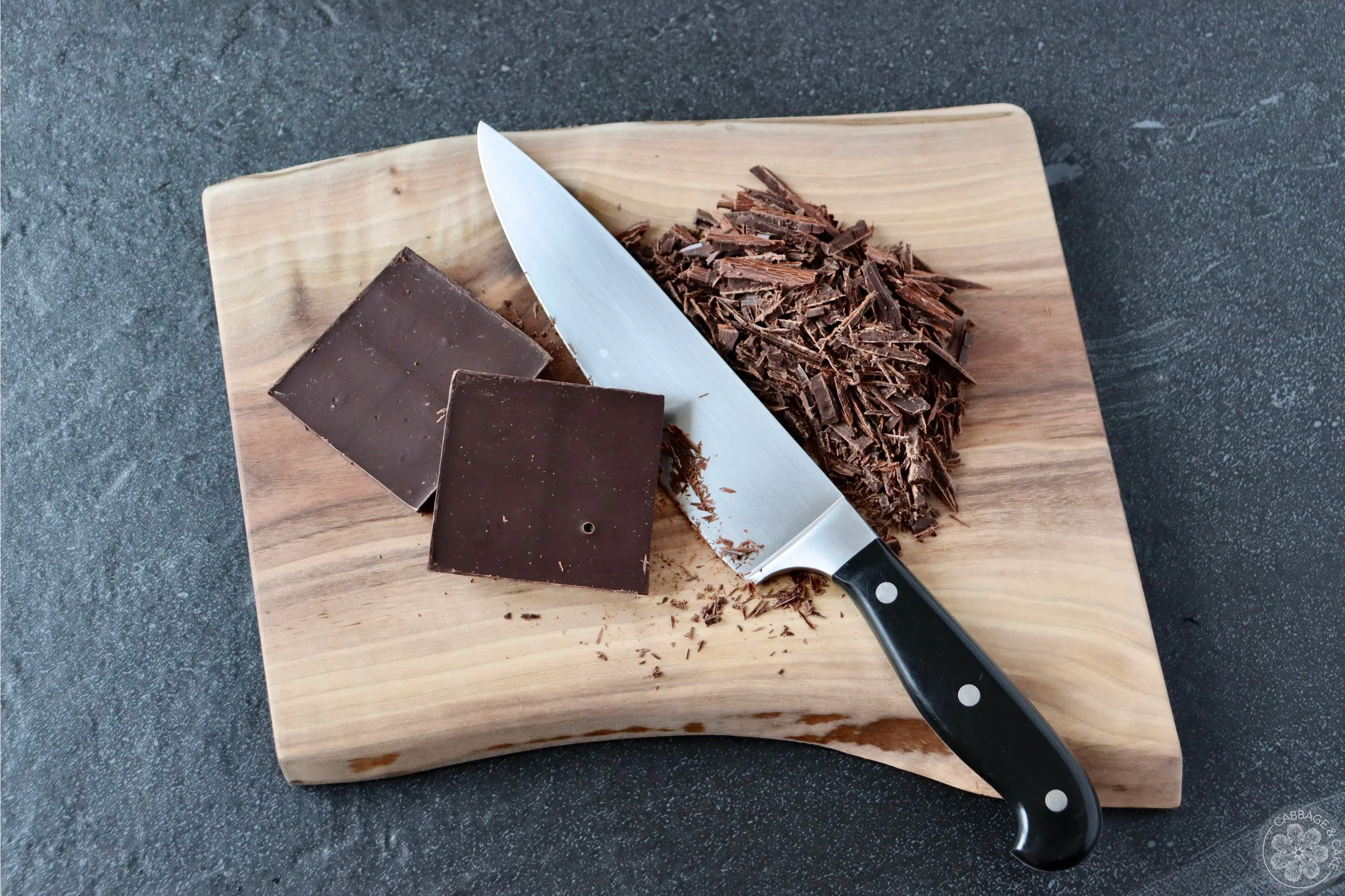 Shave your chocolate bar into fine shavings with a big kitchen knife and put into a medium sized heat-proof bowl.