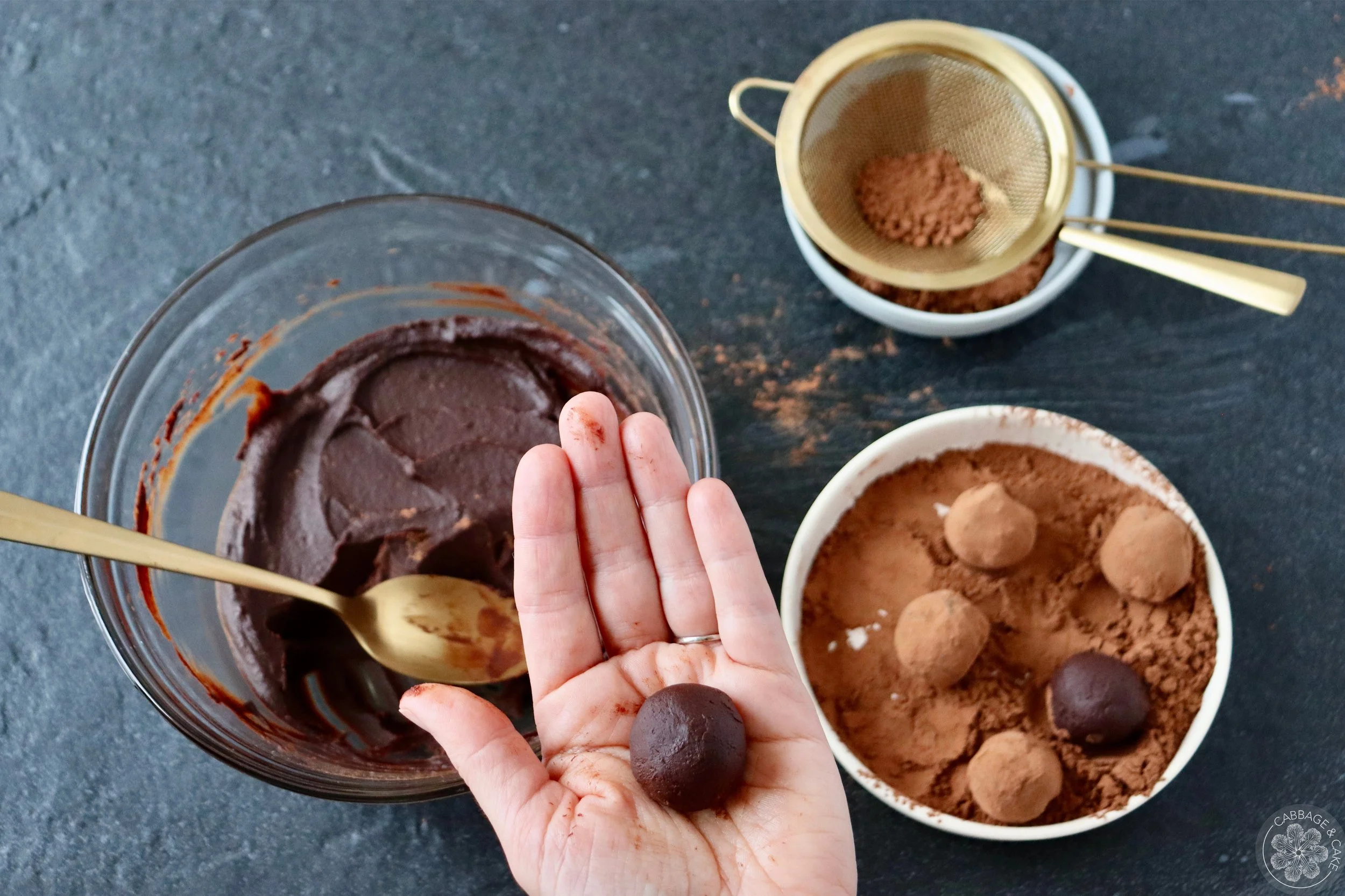 Scoop a small amount of the mixture with a spoon or scooper and roll it into small balls with your hands. Cold hands or thin gloves can be helpful in stopping the ganache from melting. I like to wash my hands with cold water after I rolled a couple of truffles.