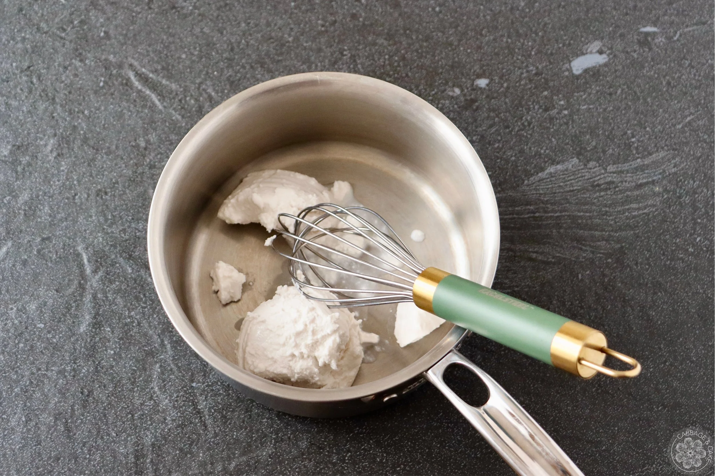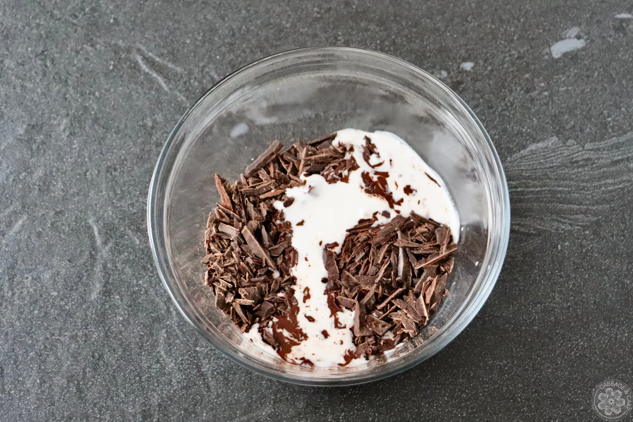 Pour the hot cream over your chocolate shavings and let sit for 3- 5 minutes until the chocolate is melted.