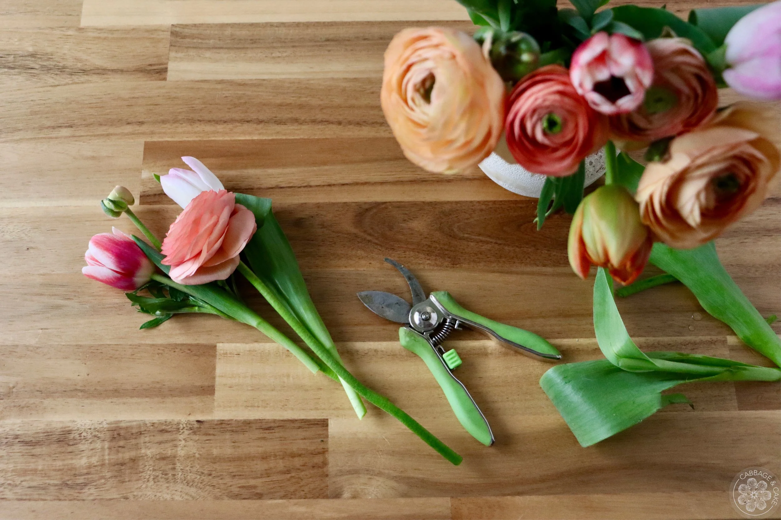 Prep your spring flowers by taking big leaves of the stems and cutting them into desired lengths.