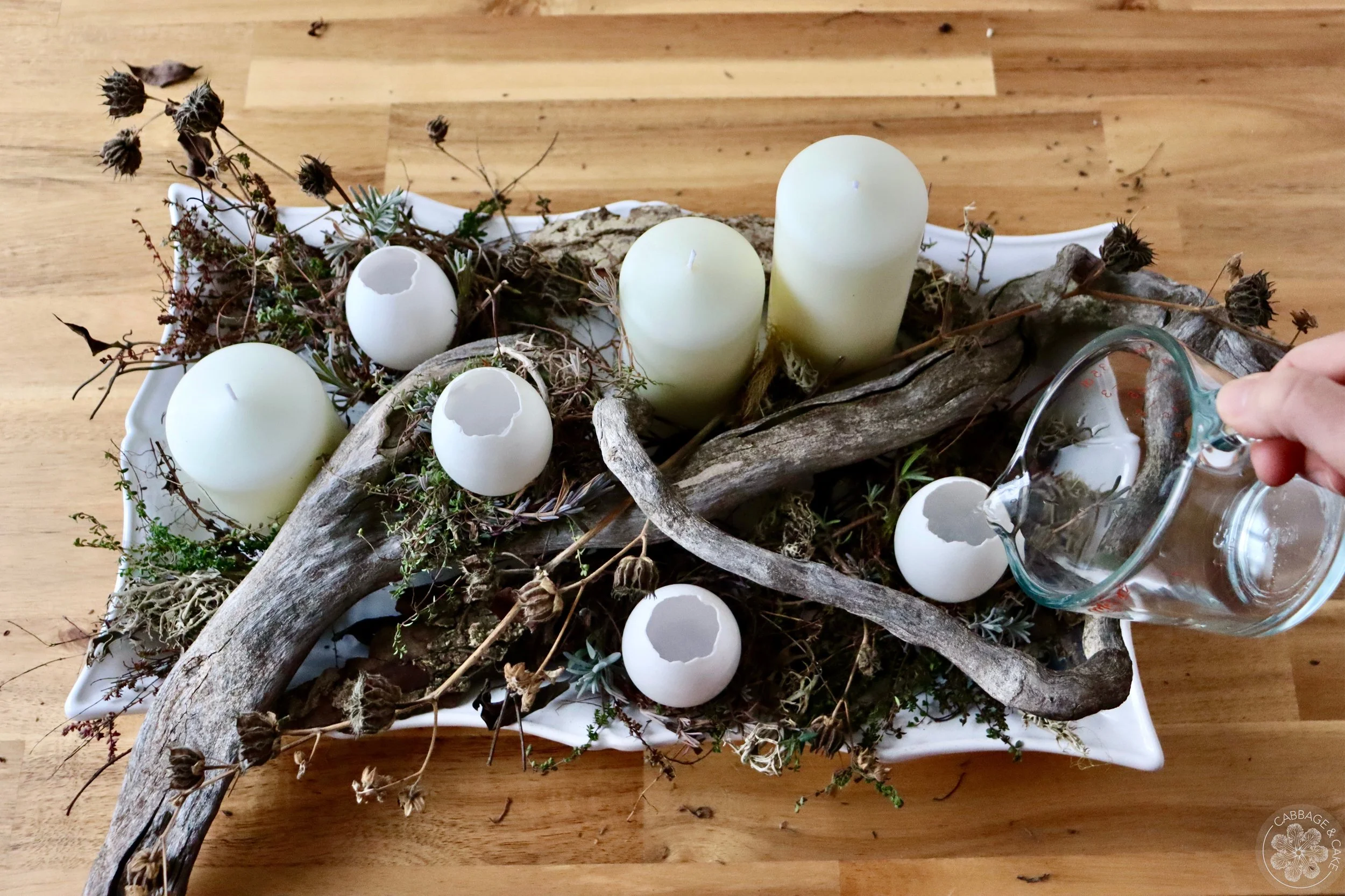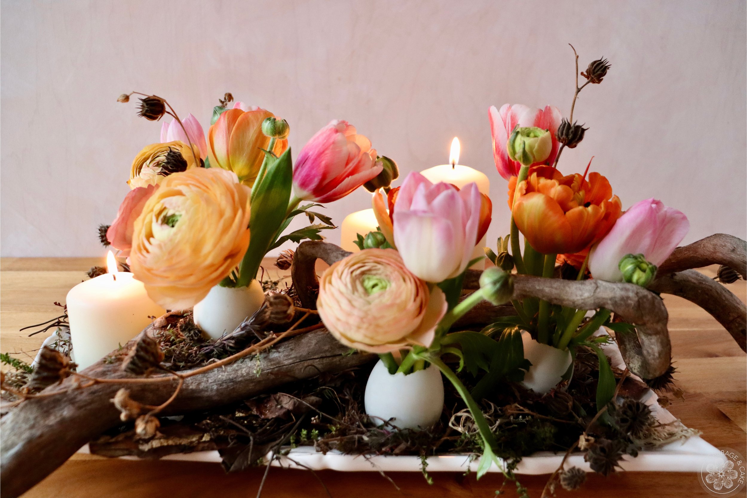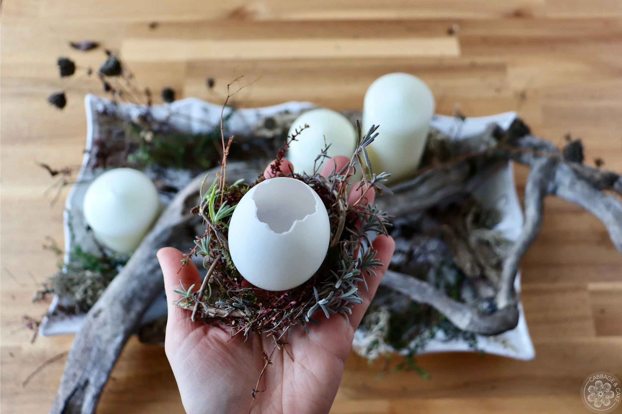 Their bigger size and thicker shell also make them great for DIY projects like this Easter arrangement as cute vases for beautiful pastel-coloured tulips and ranunculus, some driftwood from the lake, moss, seed pods and some white pillar candles in different heights.