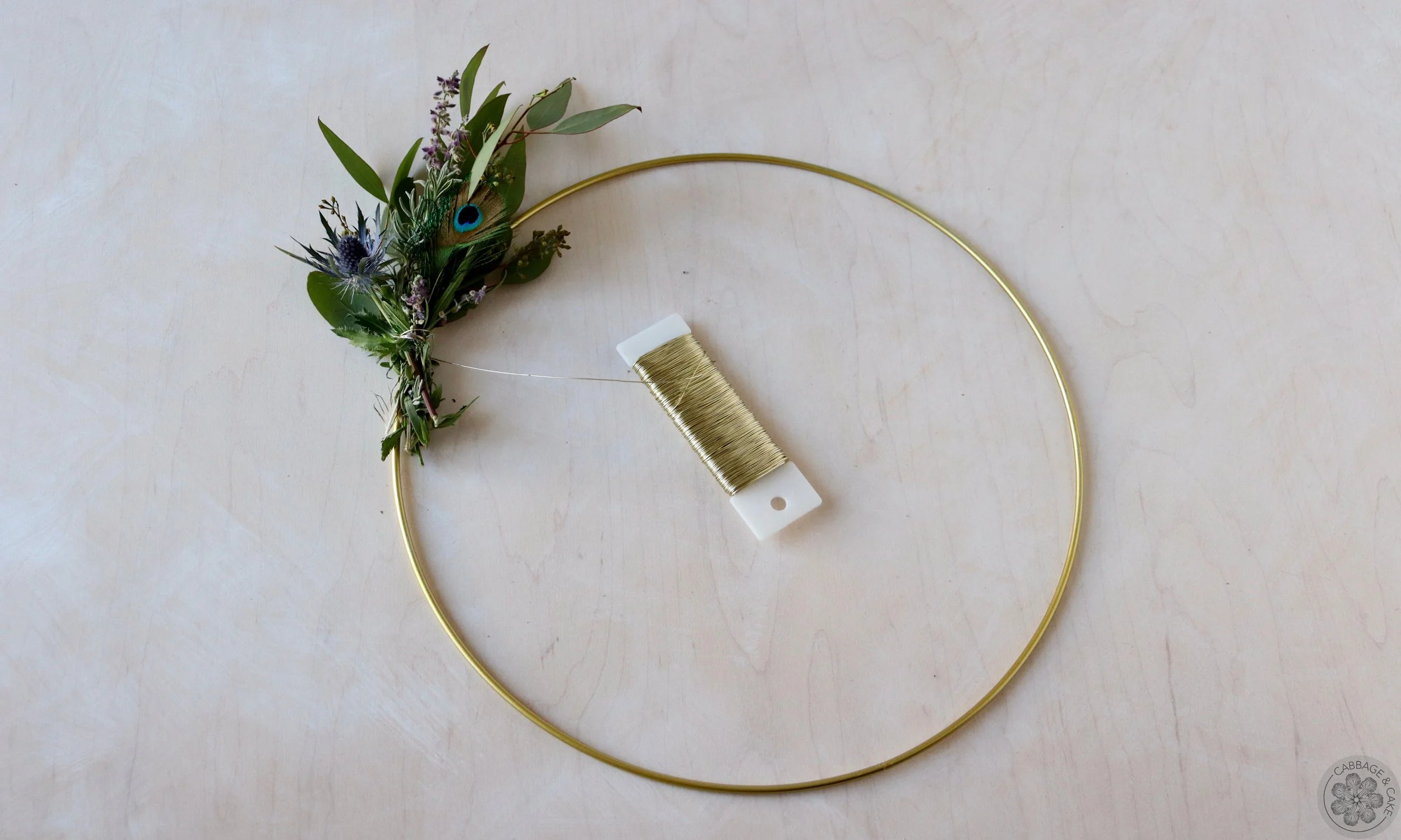 Attach the end of your floristry wire roll to the floral hoop by wrapping it around tightly until it’s securely fastened and won’t slide. Don’t cut the floristry wire at any time! It will make it easier to attach the small bundles one after the other.