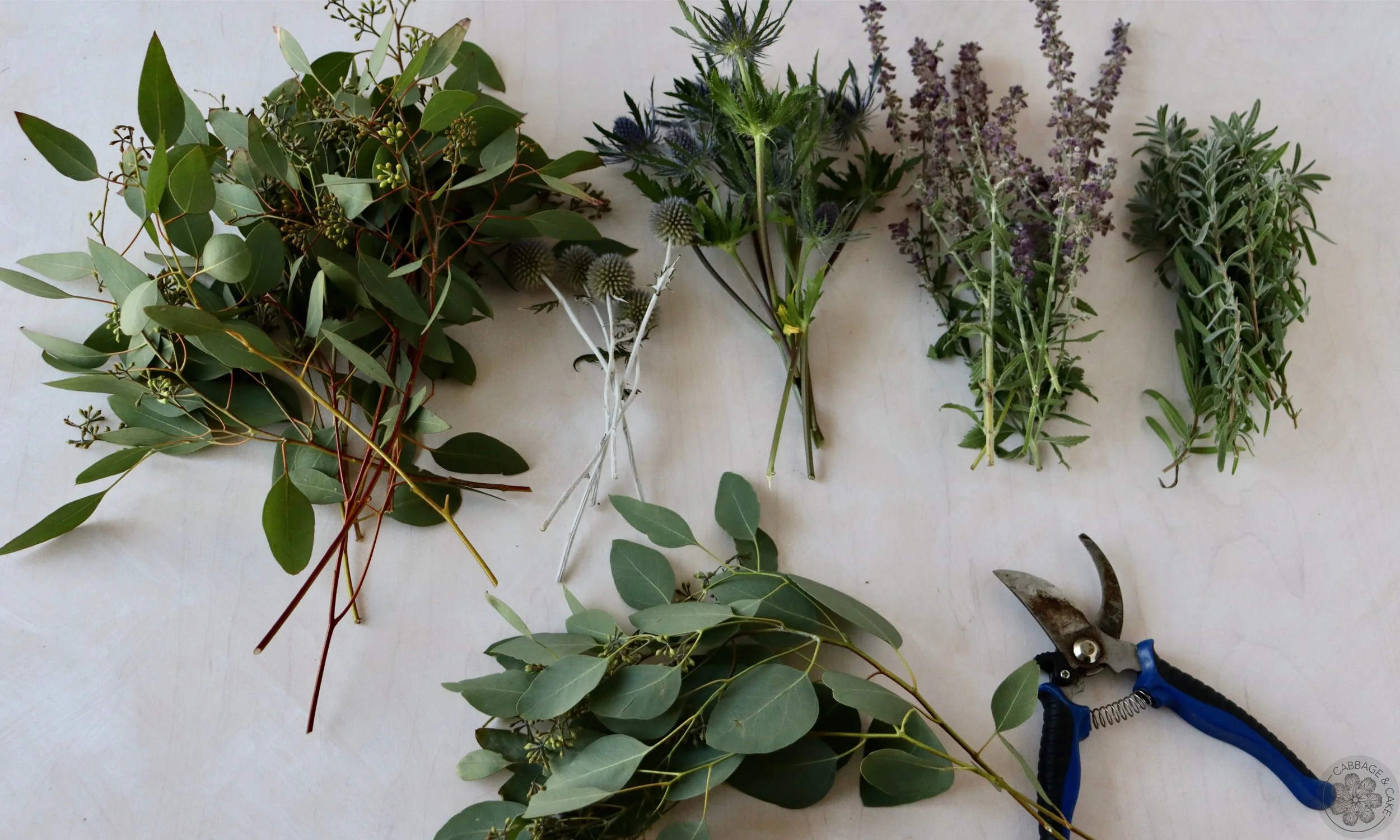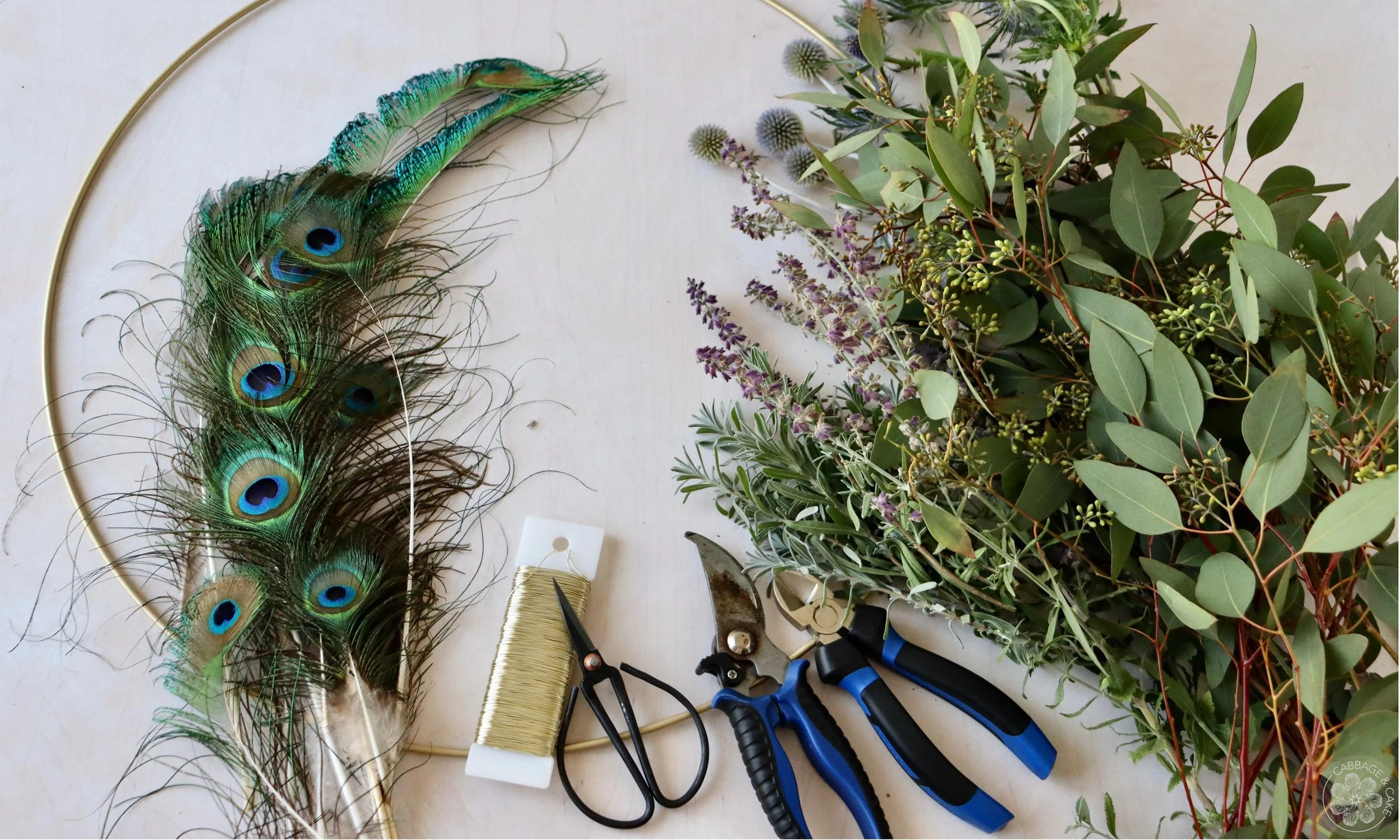 Prep your materials before you start assembling your wreath. I prefer cutting my branches, stems and feathers before making small bundles to set aside ready to be assembled all in one go, instead of stopping and making every bundle between fastening them to the hoop.