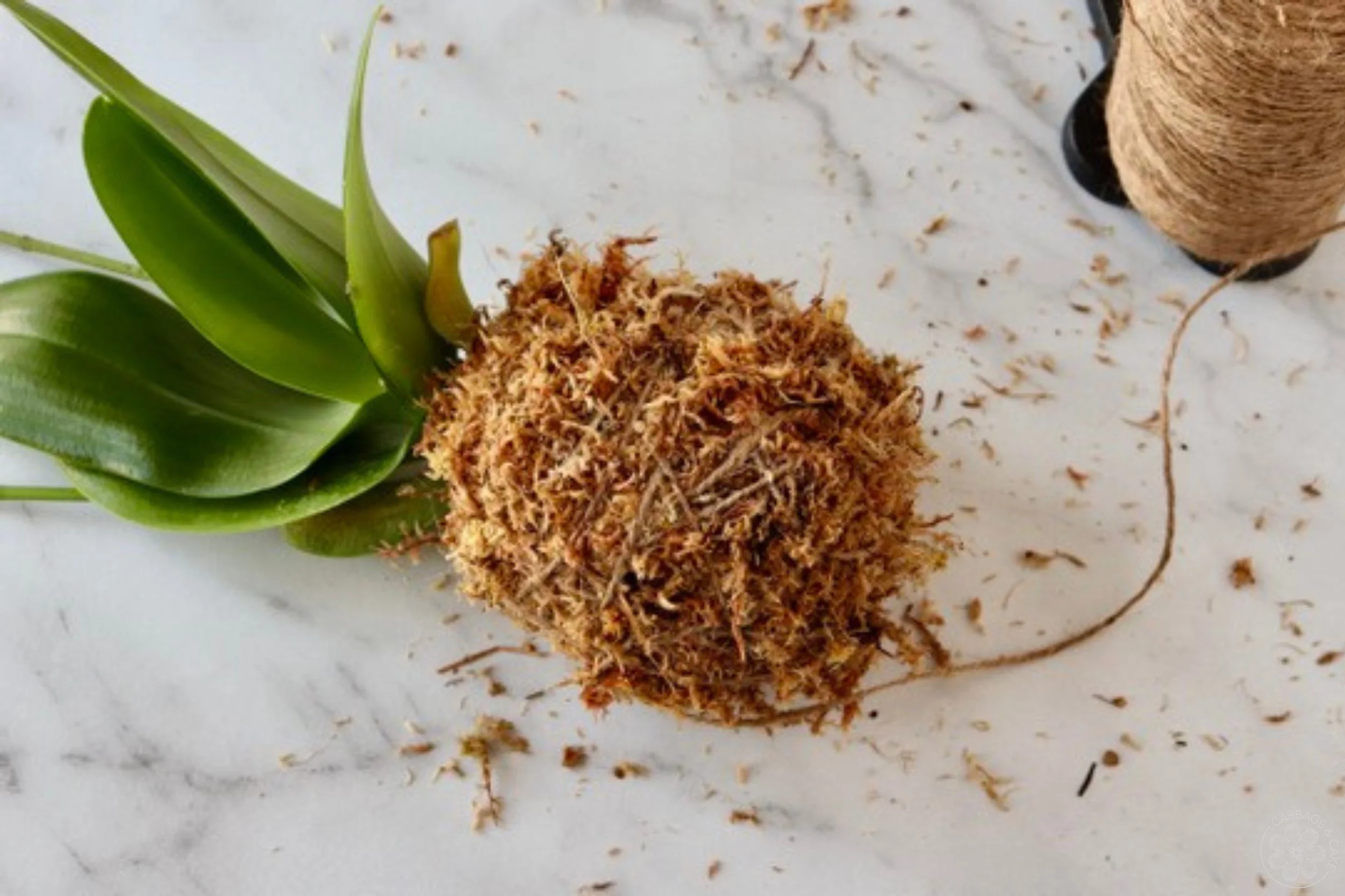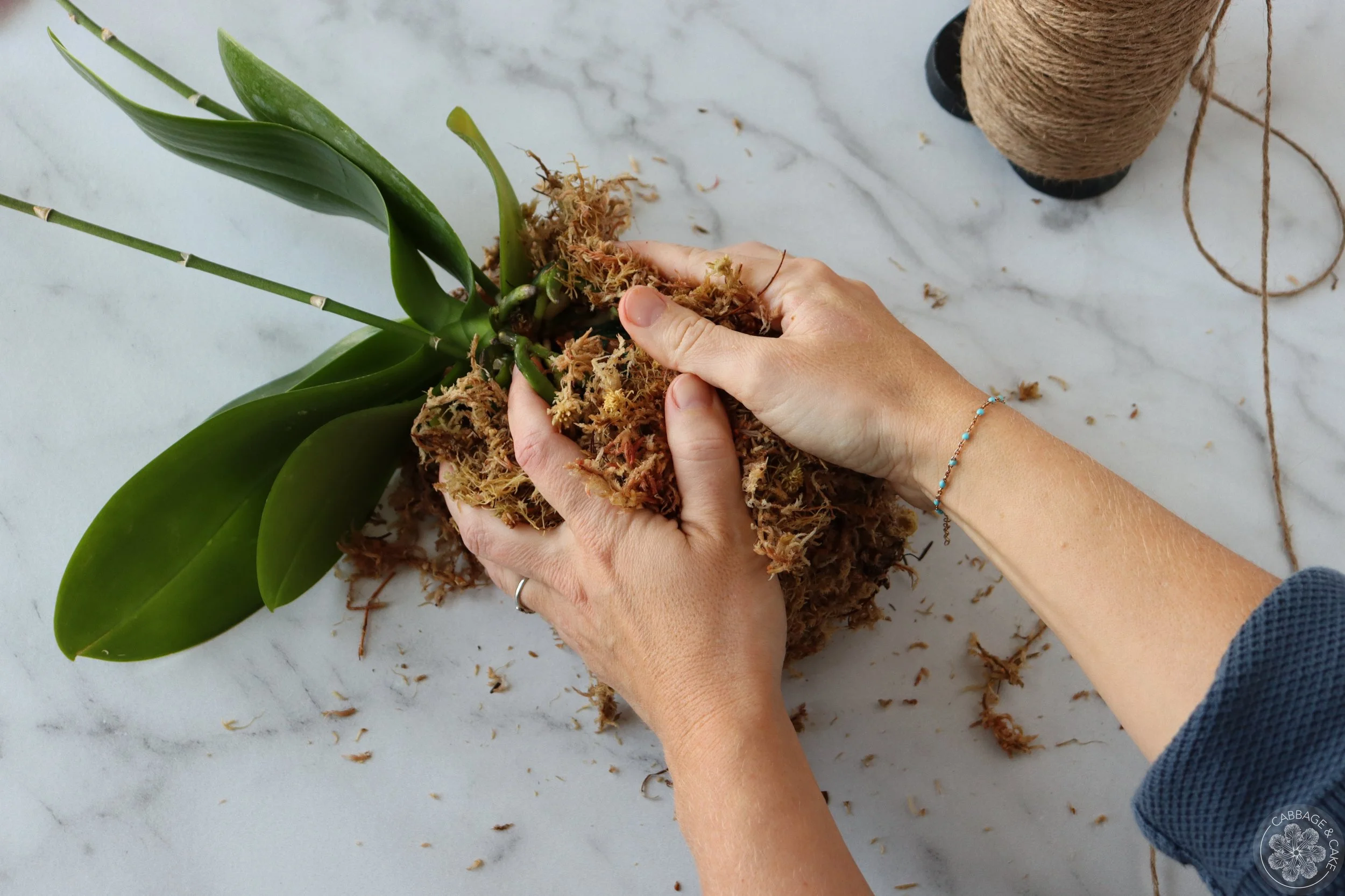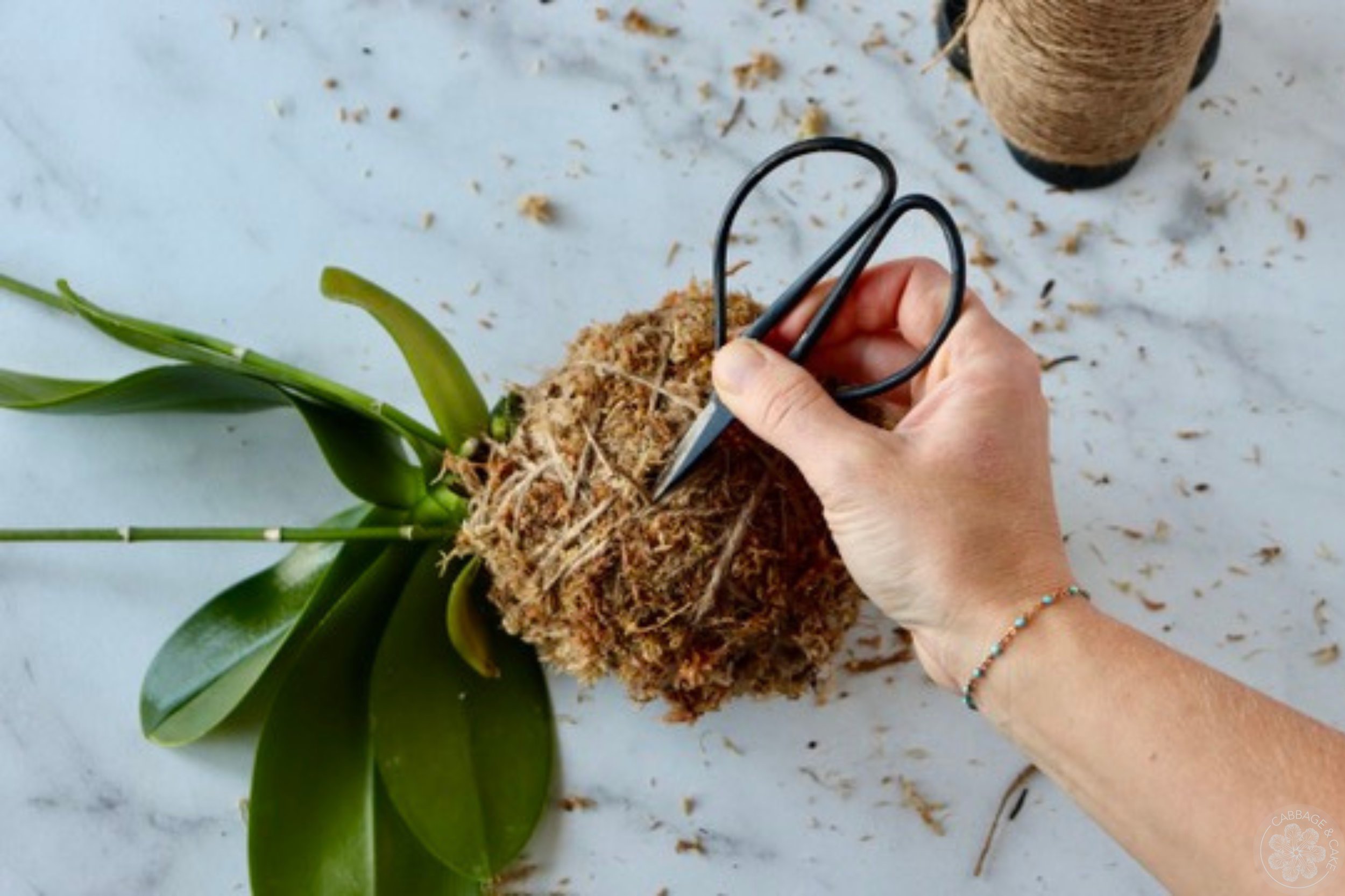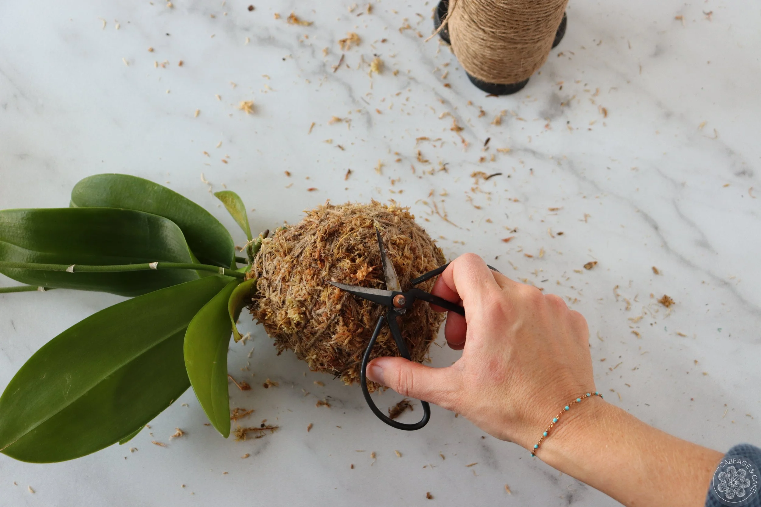 Keep wrapping the twine around the moss, keeping it as tight as you can. Be generous with your moss and twine. You don’t have to follow any pattern it just needs to hold it together and form a nice round ball in the end. You can place your moss ball on the edge of your workspace and roll it back and forth to give it a nice and evenly round shape, giving the orchid space hanging off without getting damaged at the same time.
