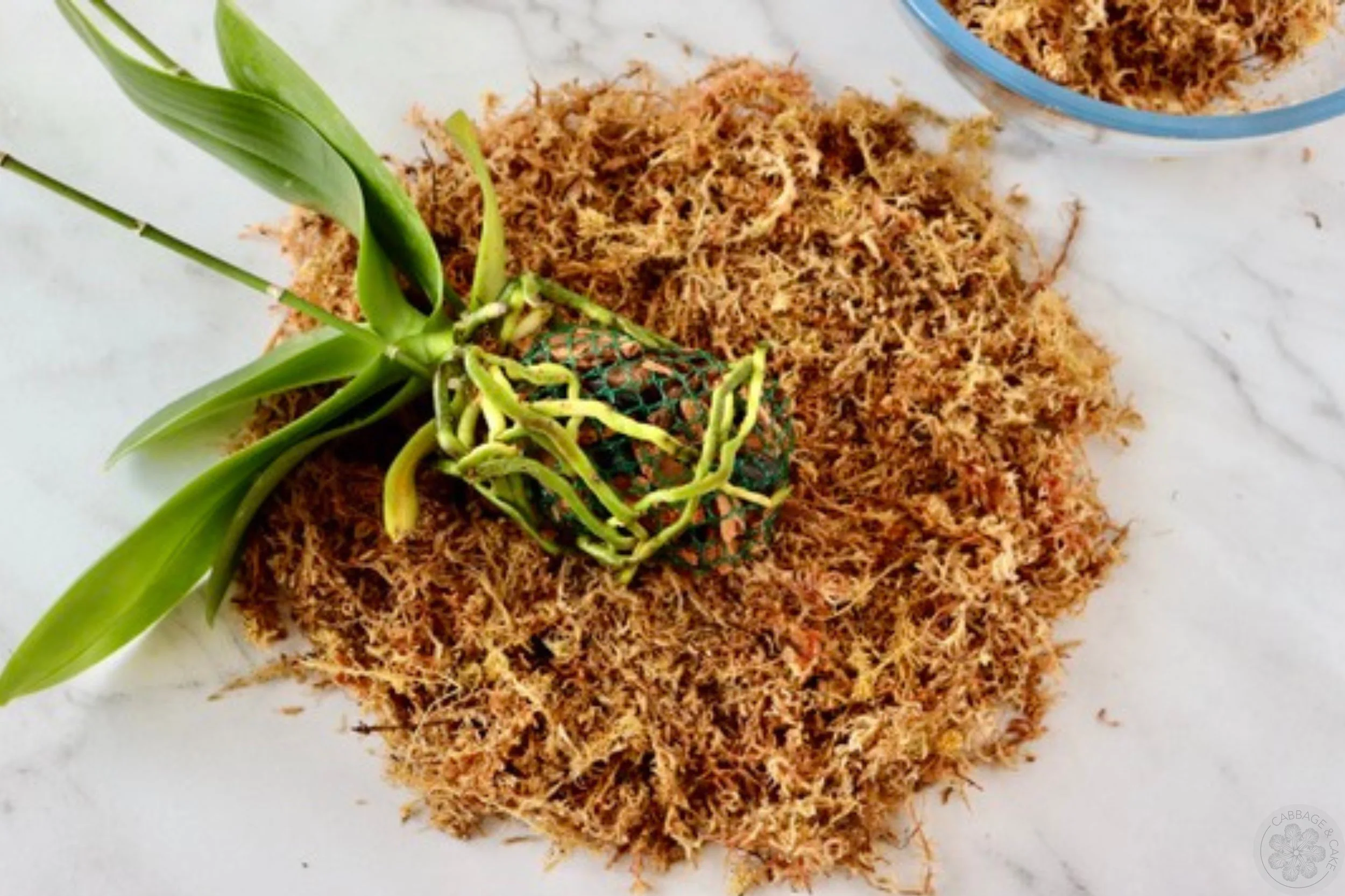 Place the orchid’s roots around the orchid potting mix in the net and set it in the middle of the sphagnum moss.