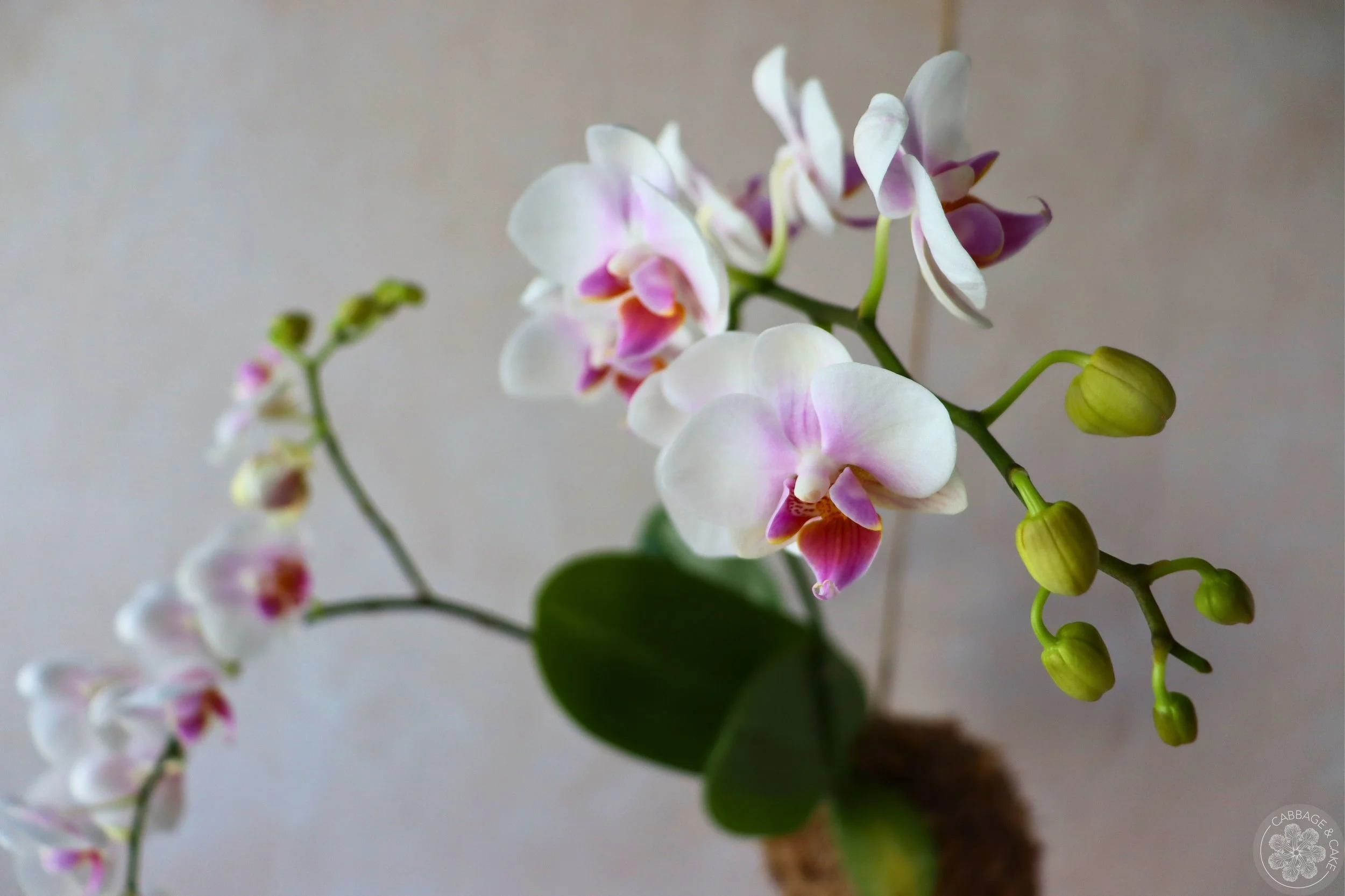 Orchids thrive in bright, humid and warm environments with good air circulation. When hanging your kokedama, avoid direct sunlight, cold drafts and fireplaces. The ones I have hanging in my bright bathroom are doing the best and I like to hang them outside underneath our deck for a couple of months of the year and bring them back inside once the temperatures drop in the fall, since we have a hot and humid summer where I live.