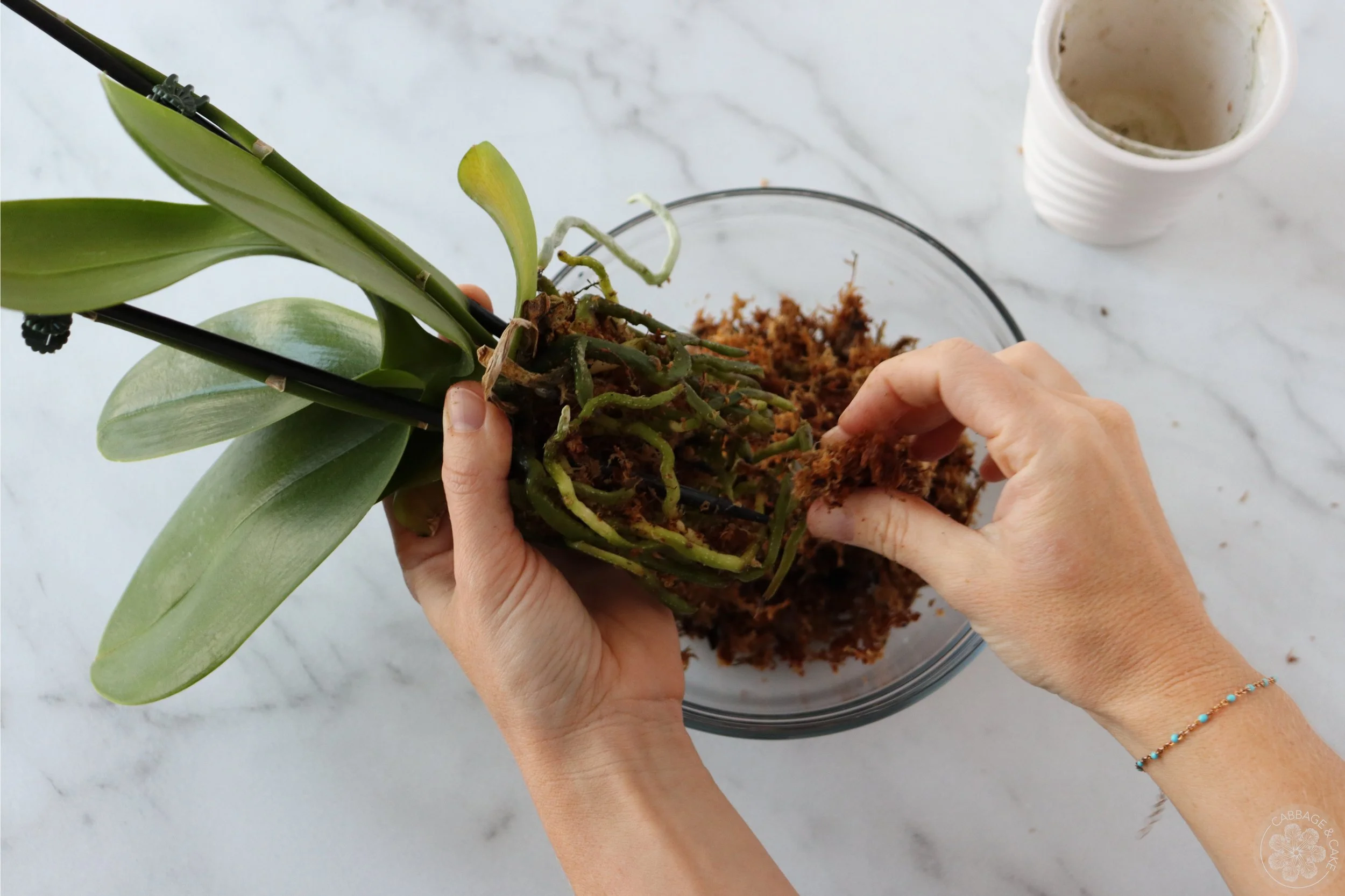 Remove your orchid from its container and carefully remove and discard the orchid mix or moss it came in.