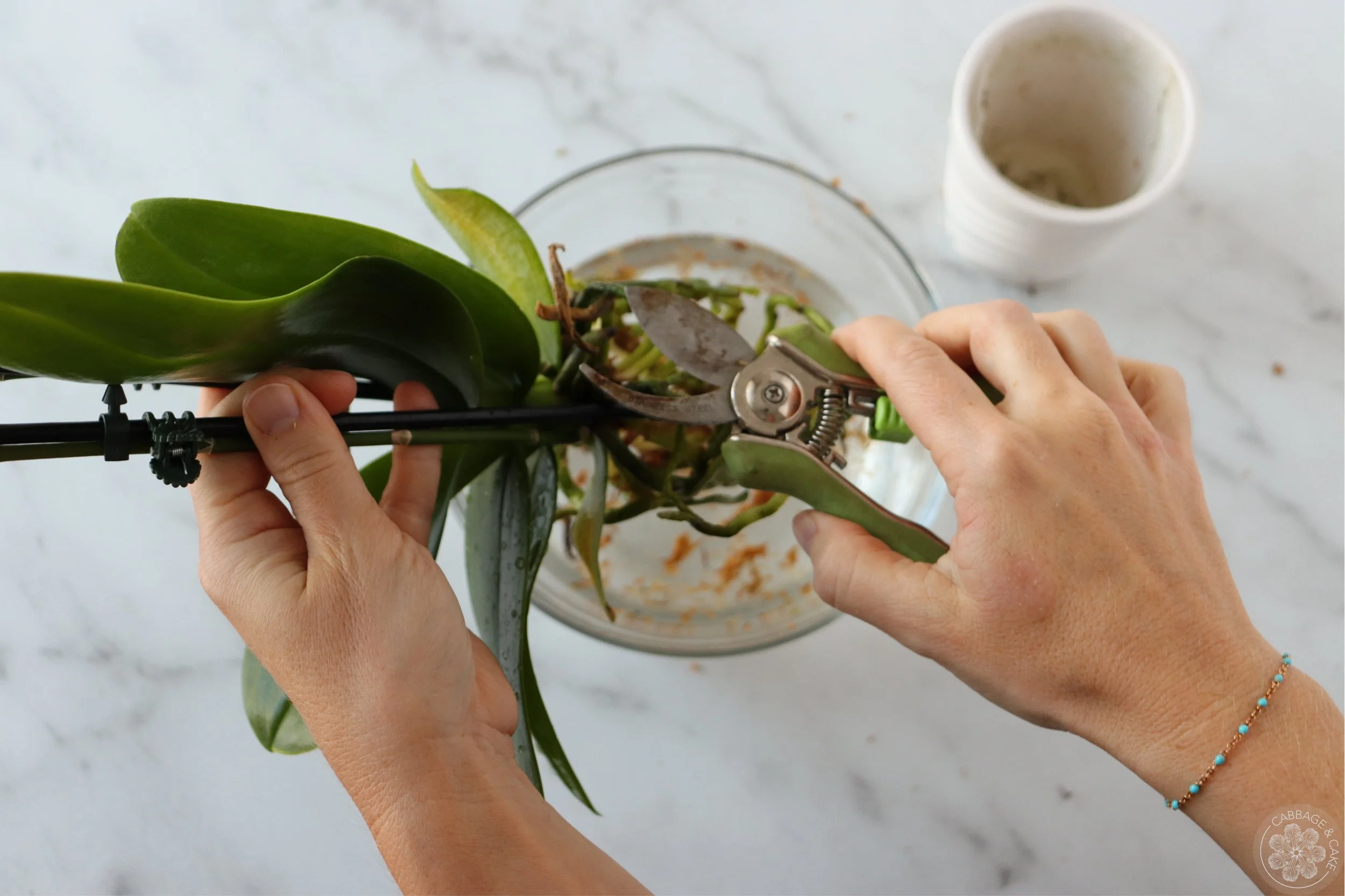 Rinse off the roots of your orchid and cut off any dead or rotten roots with clean, sharp pruners.