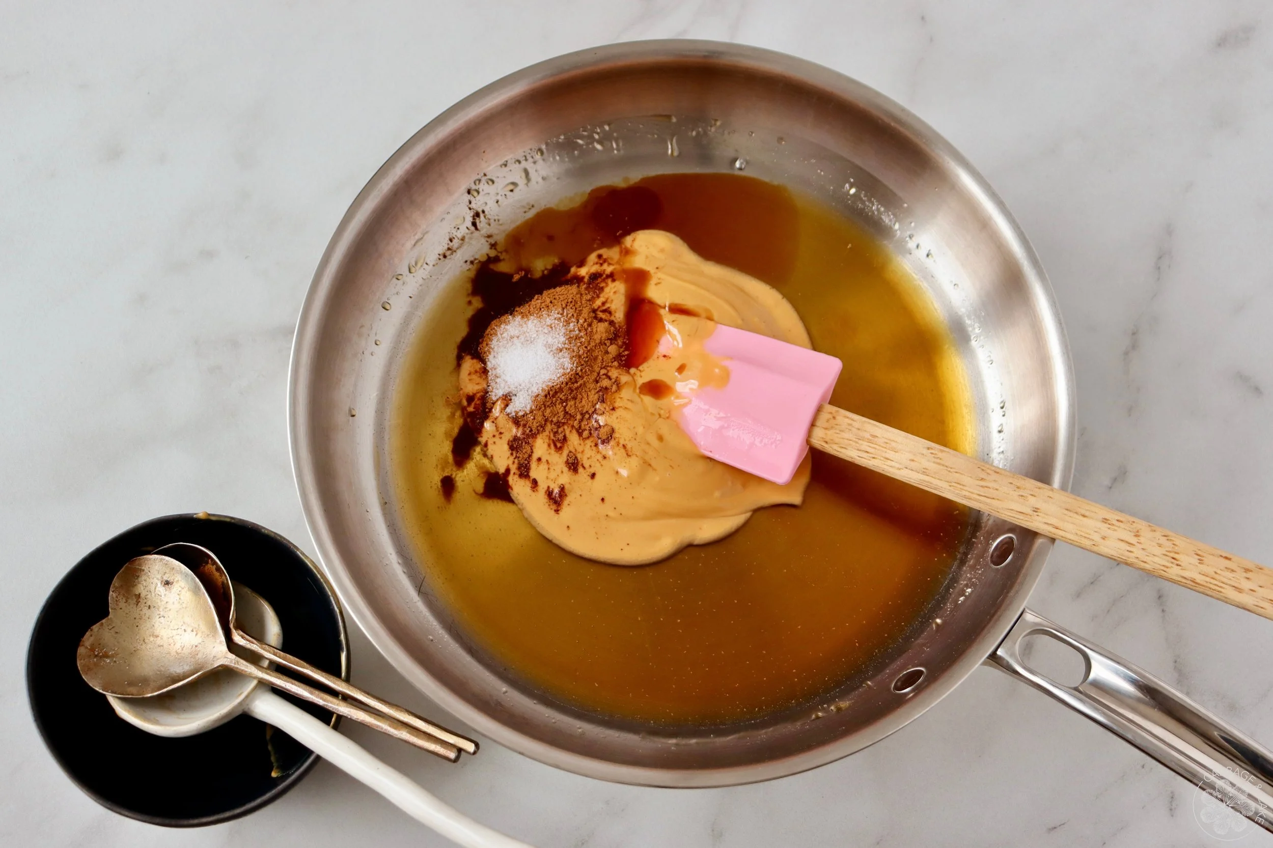 Stir in natural, smooth peanut butter, pure vanilla extract, ground cinnamon and salt and mix well.