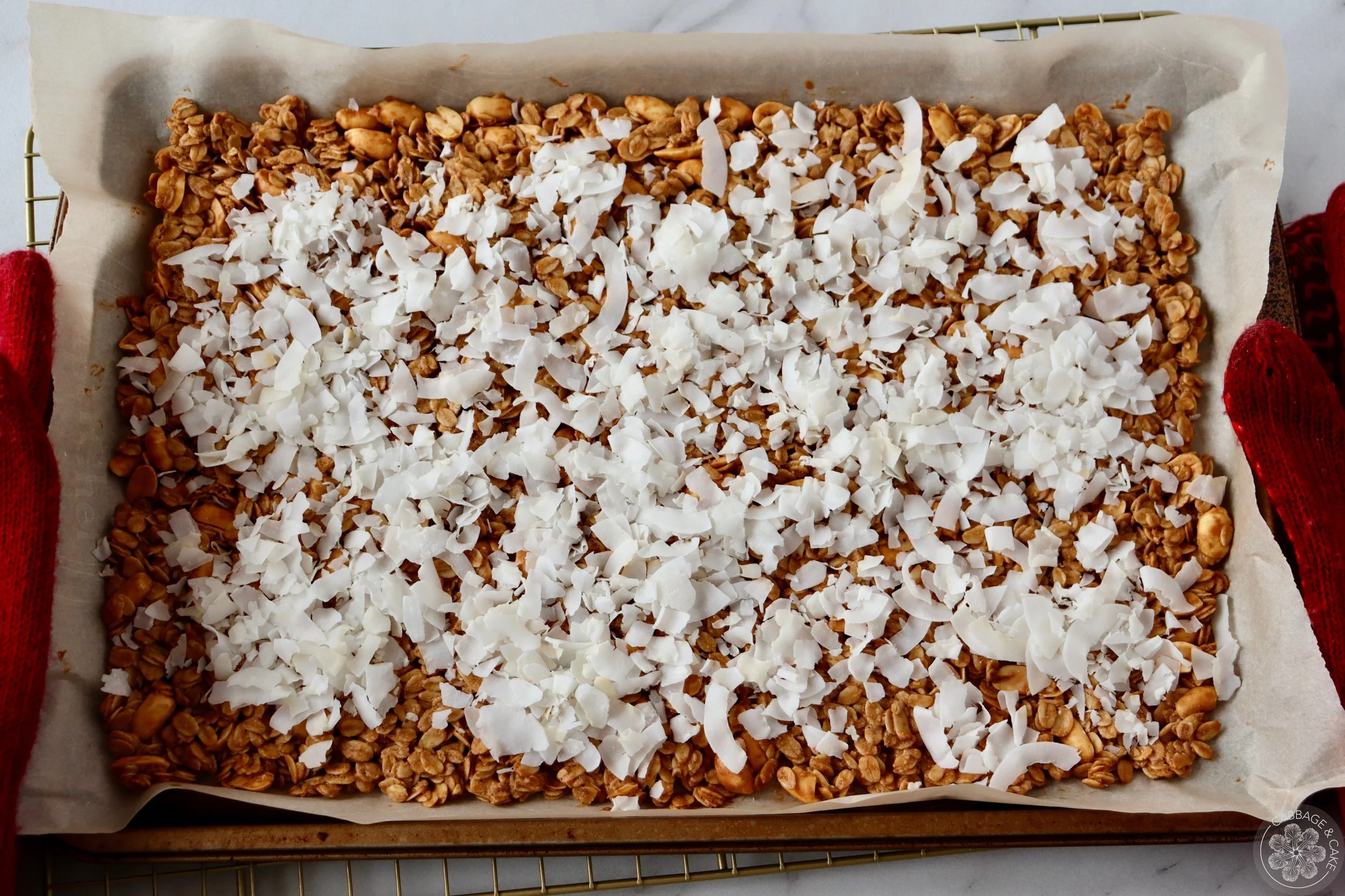 Sprinkle the coconut flakes over the granola and bake for another 3- 5 minutes. Every oven works a bit differently; you might want to watch for the last 2 minutes to avoid the granola from getting too dark.