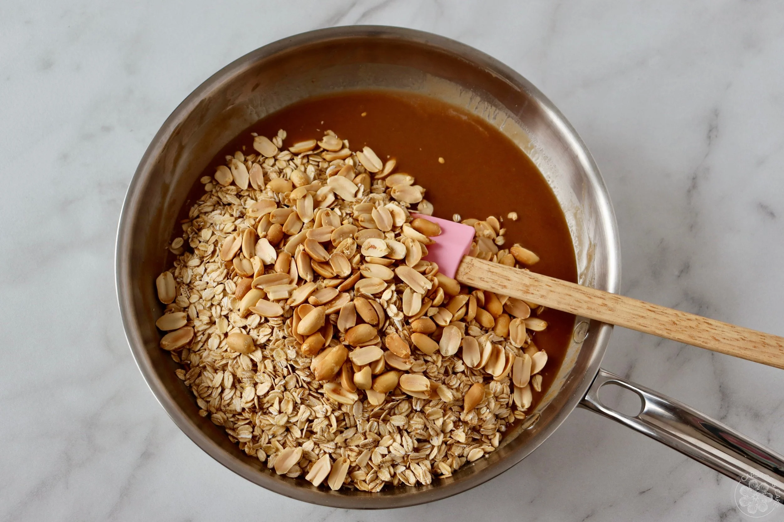Add in the rolled oats and peanuts and mix well until everything is evenly coated and combined nicely.