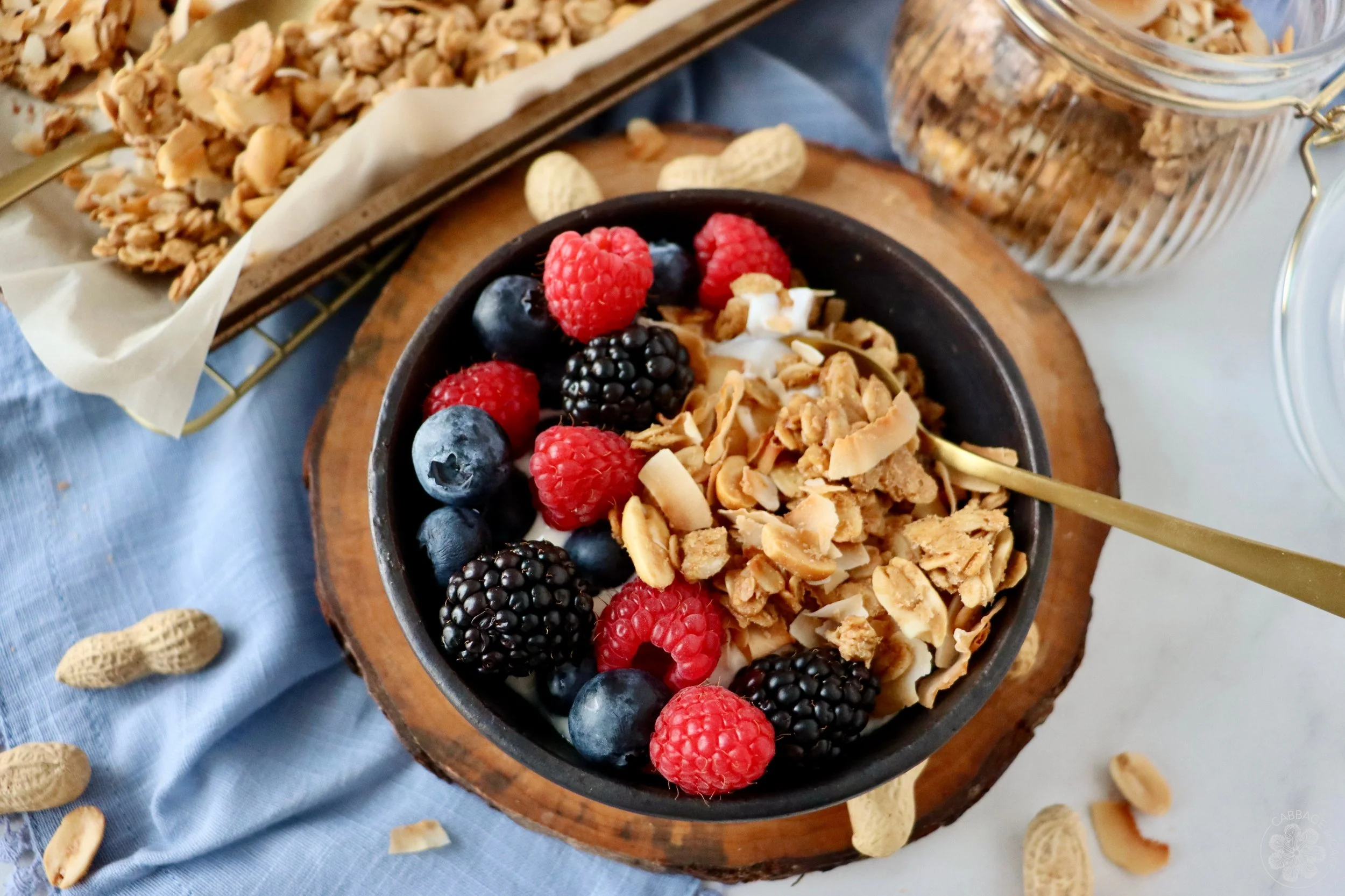 Homemade maple peanut granola is a great breakfast option, either as a cereal with milk or sprinkled over your favourite yogurt and fresh fruit, added to a smoothie bowl or as a crunchy snack on its own. It’s super easy to make and you can add in different nuts like pecans, walnuts, pumpkin seeds, some dried fruit like raisins or cranberries or a handful of chocolate chips.
