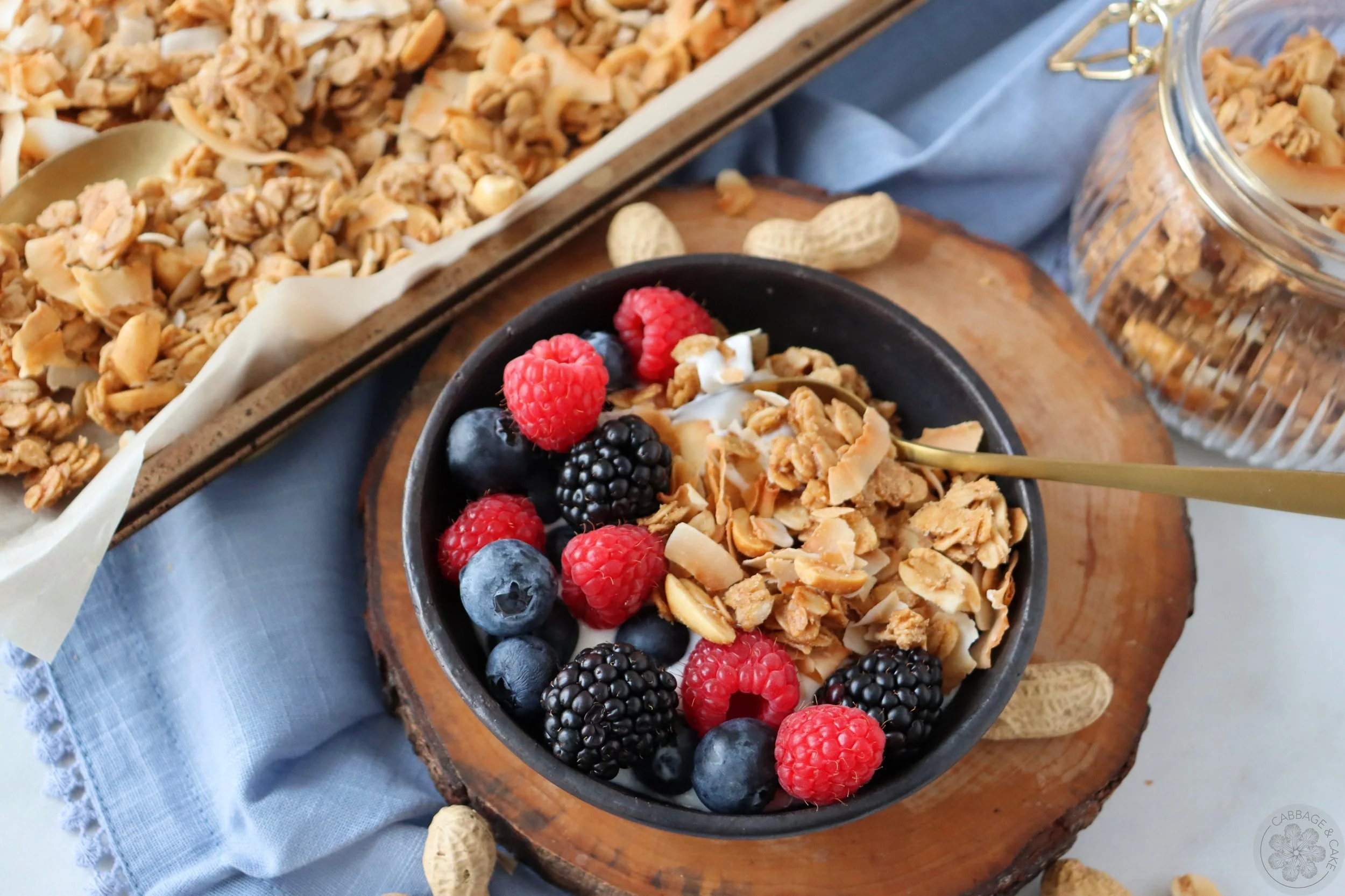 Did you know March 1st is National Peanut Butter Lover’s Day? What better day to post one of my favourite Peanut butter recipes! Extra crunchy and chunky maple peanut granola that’s homemade, healthy and delicious.