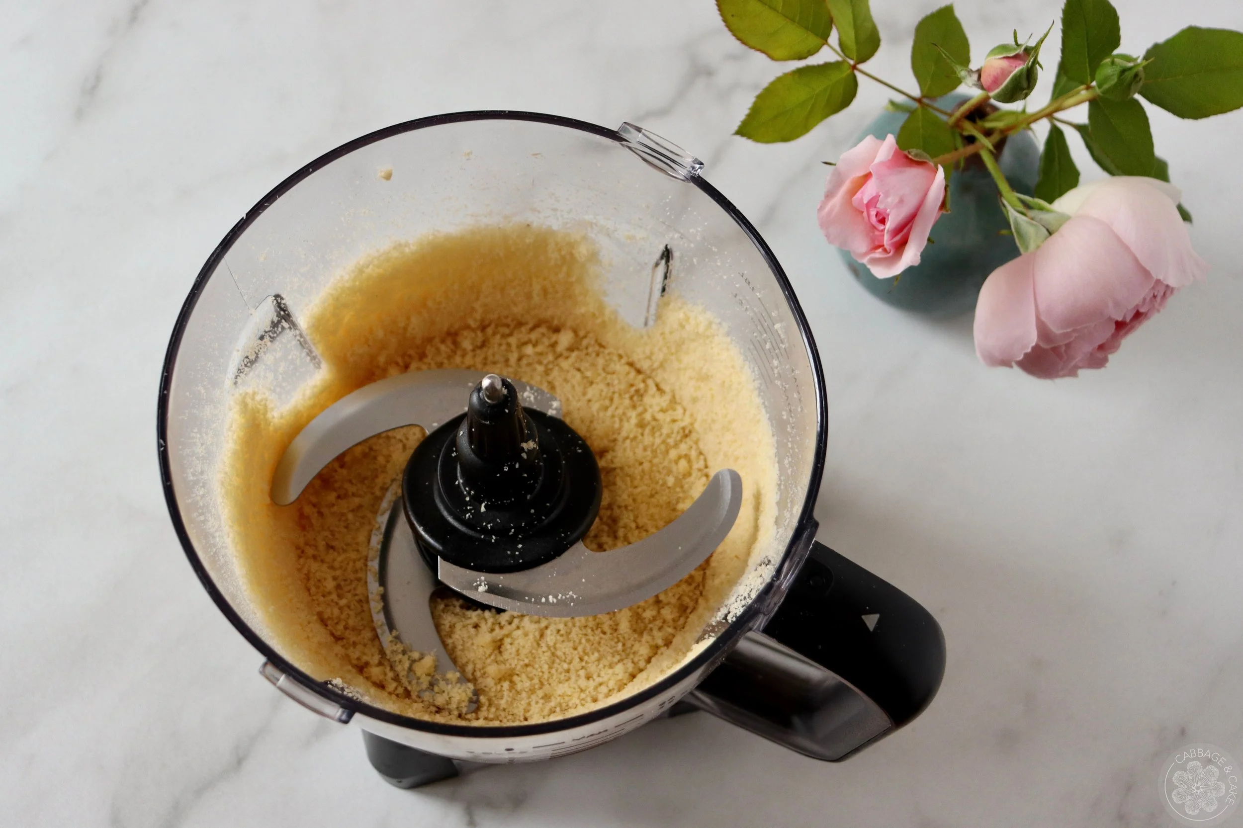 Grind almonds into fine flour in a food processor fitted with the blade attachment.