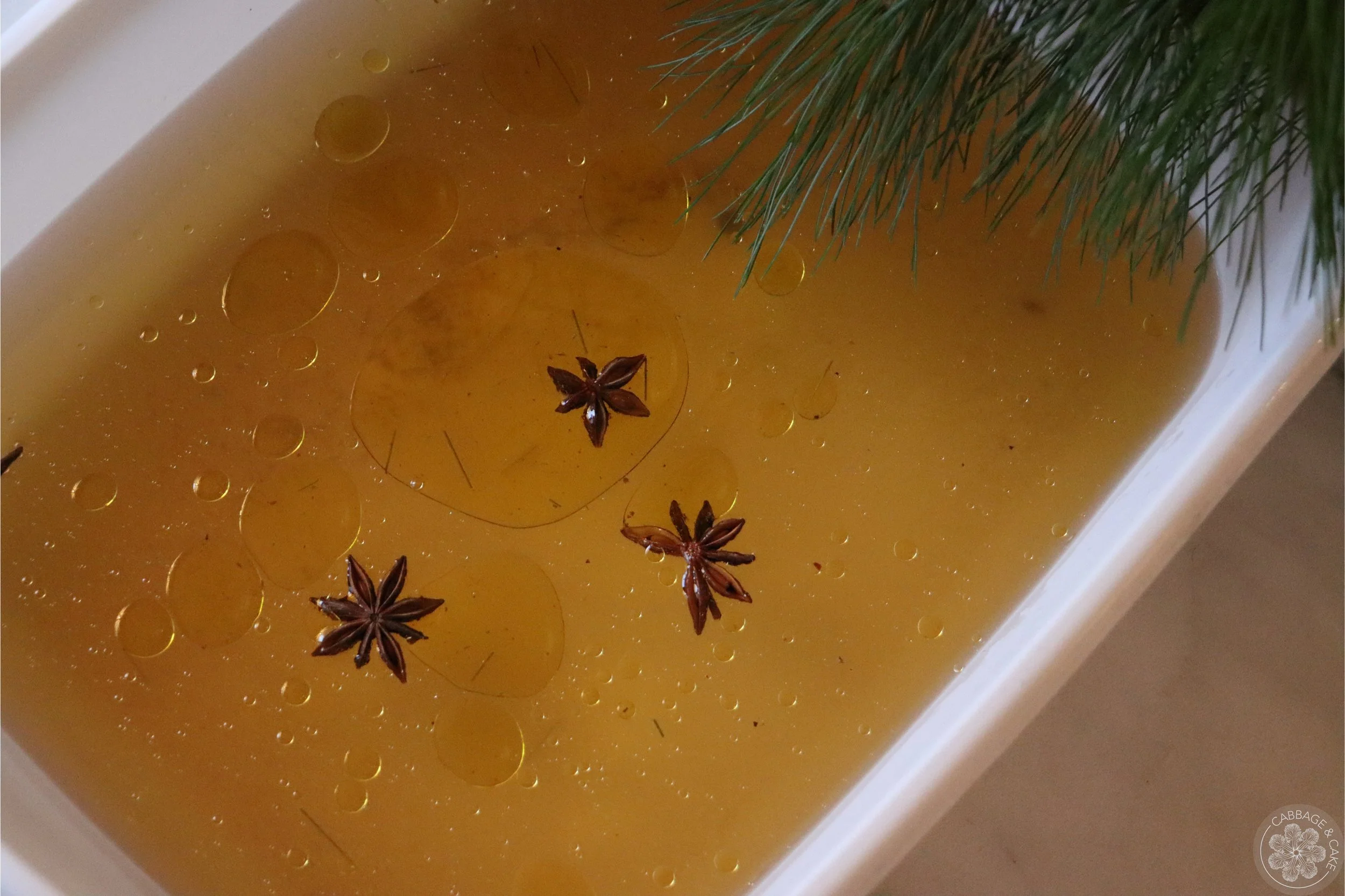 Add your chopped needles and crushed spices to a pot with two liters of water, bring to a boil and steep for 15 minutes.