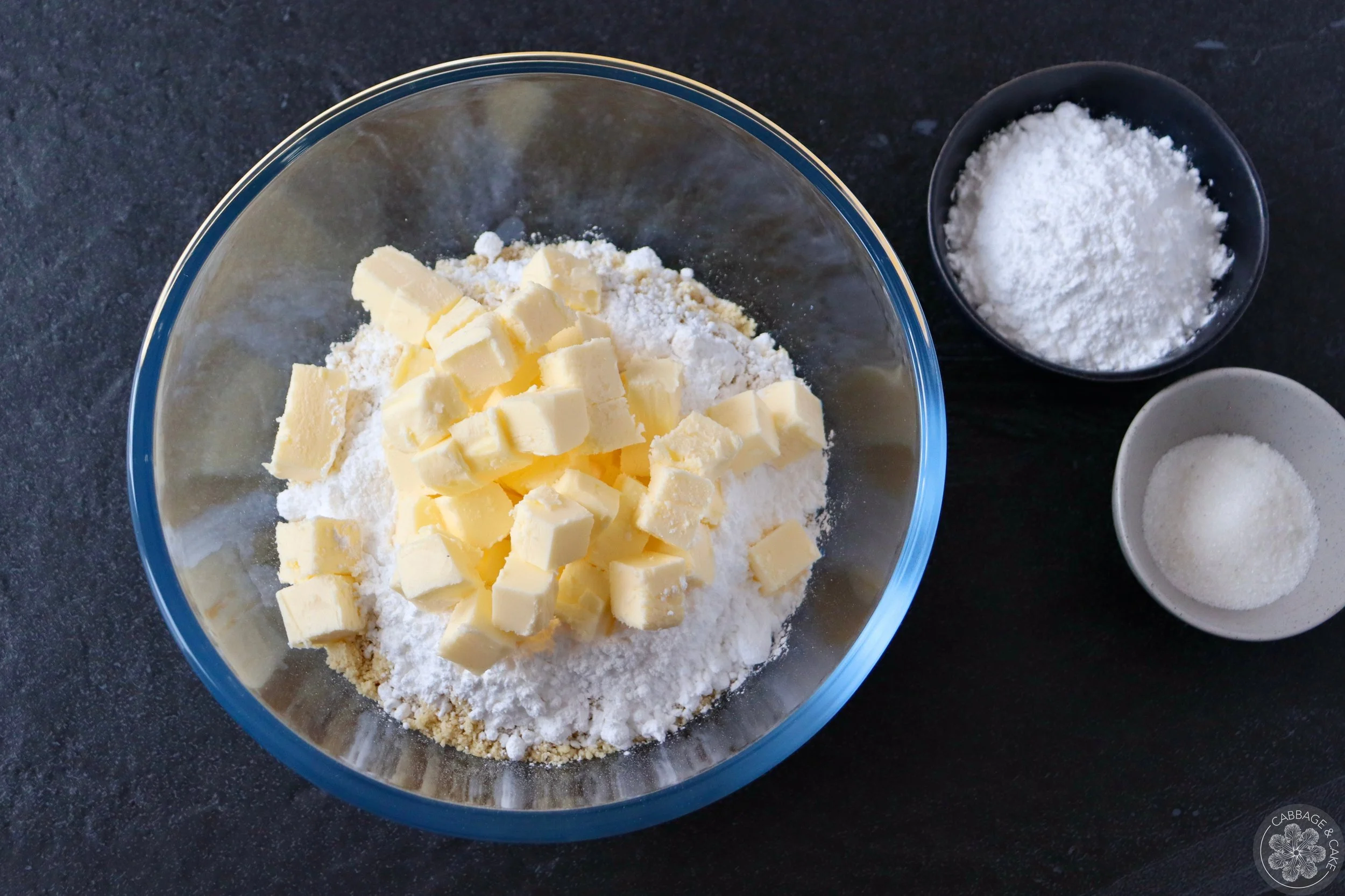 Combine unsalted butter, flour, almond flour and icing sugar in your mixing bowl.